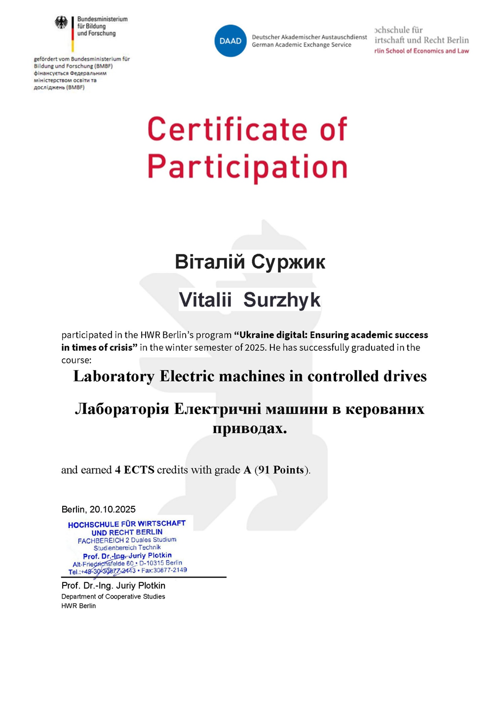 Починаючи з вересня 2025 року учасники пройшли навчальний курс «Лабораторія електричних машин у керованих приводах», який складався з десяти занять по чотири години (усього 40 годин) і проводився онлайн під керівництвом професора, доктора технічних наук Віктора ПЕТРУШИНА з Одеського національного політехнічного університету.