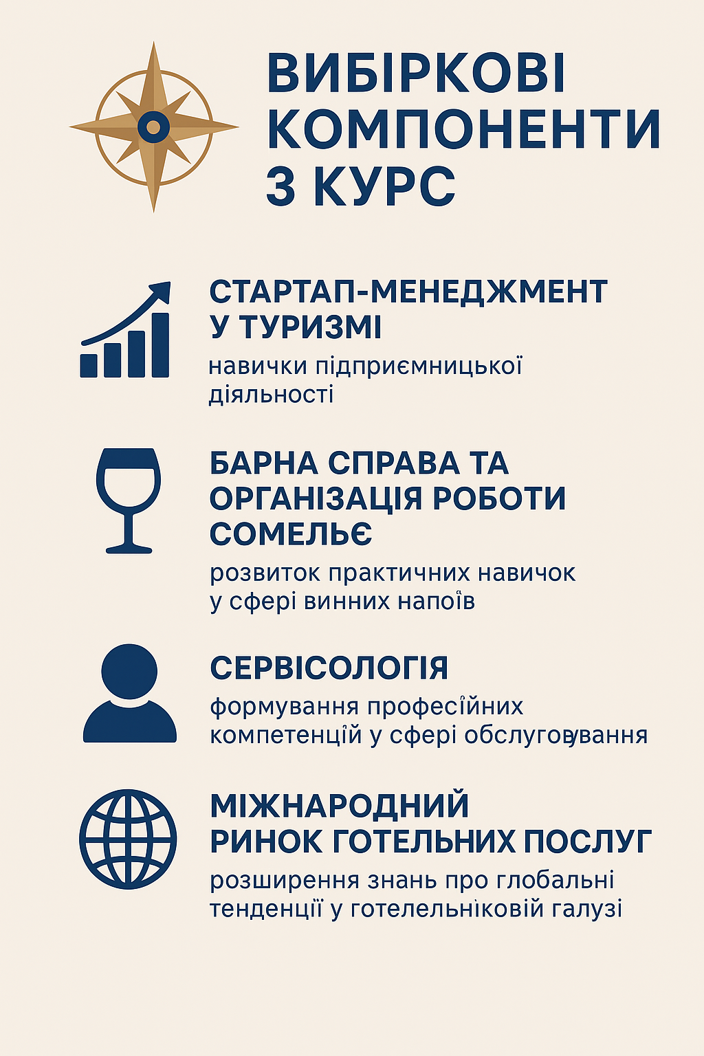 Здобувачі третього курсу формували перелік дисциплін сьомого та восьмого семестрів, серед яких були «Стартап-менеджмент у туризмі», «Барна справа та організація роботи сомельє», «Сервісологія», «Міжнародний ринок готельних послуг», «Логістика в туризмі», «Договірне і трудове право», «Лідерство і командоутворення», які формують підприємницьке мислення, управлінські компетентності та культуру сервісу. Завдяки цим дисциплінам здобувачі набувають умінь створювати конкурентоспроможні туристичні продукти, організовувати ефективну командну роботу й застосовувати правові знання у професійній діяльності.