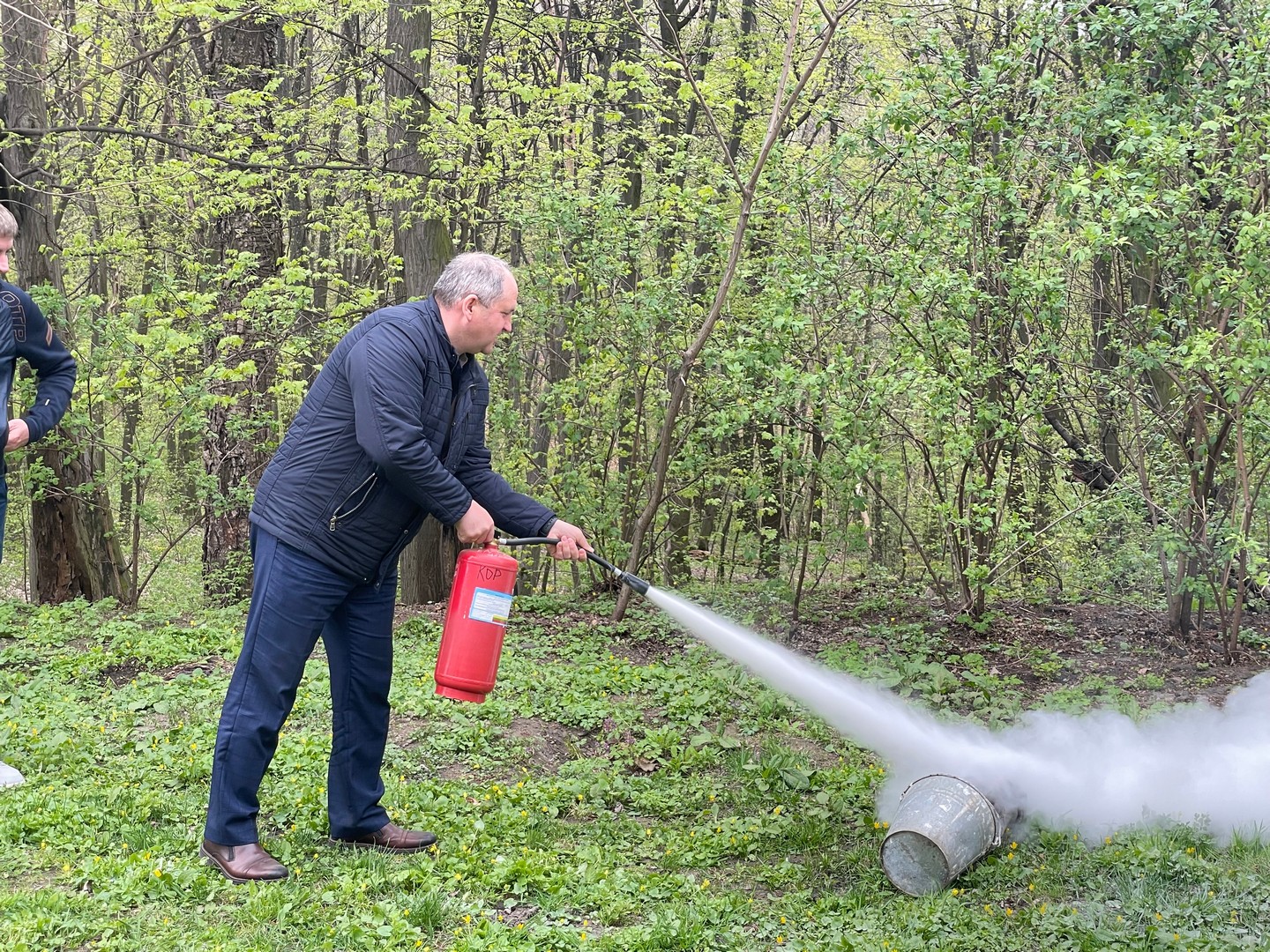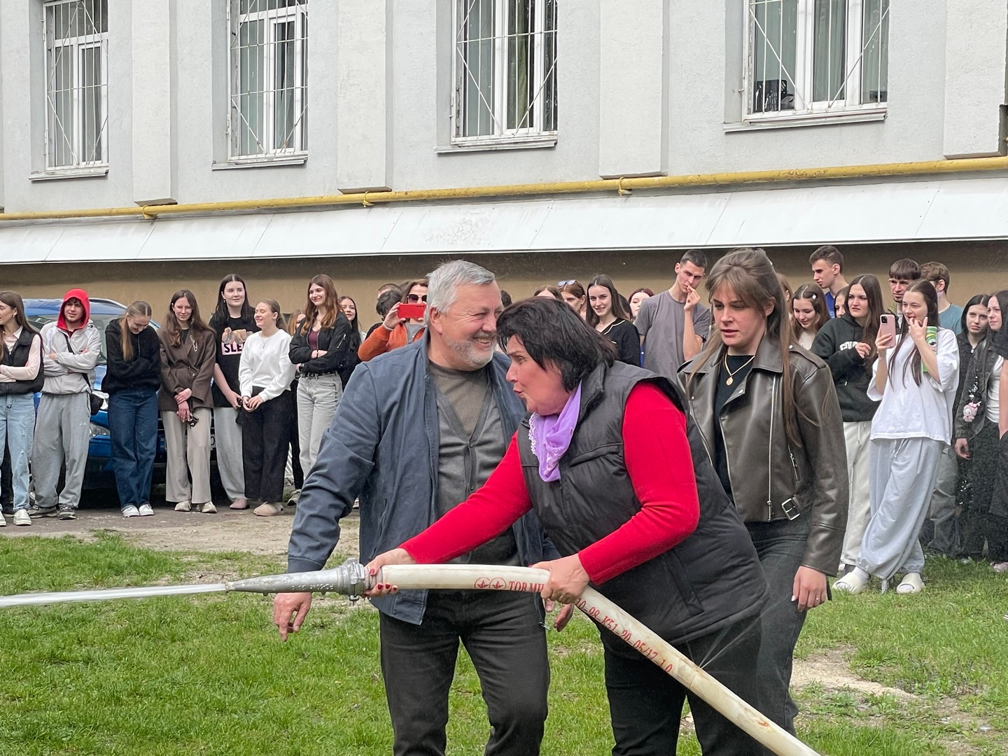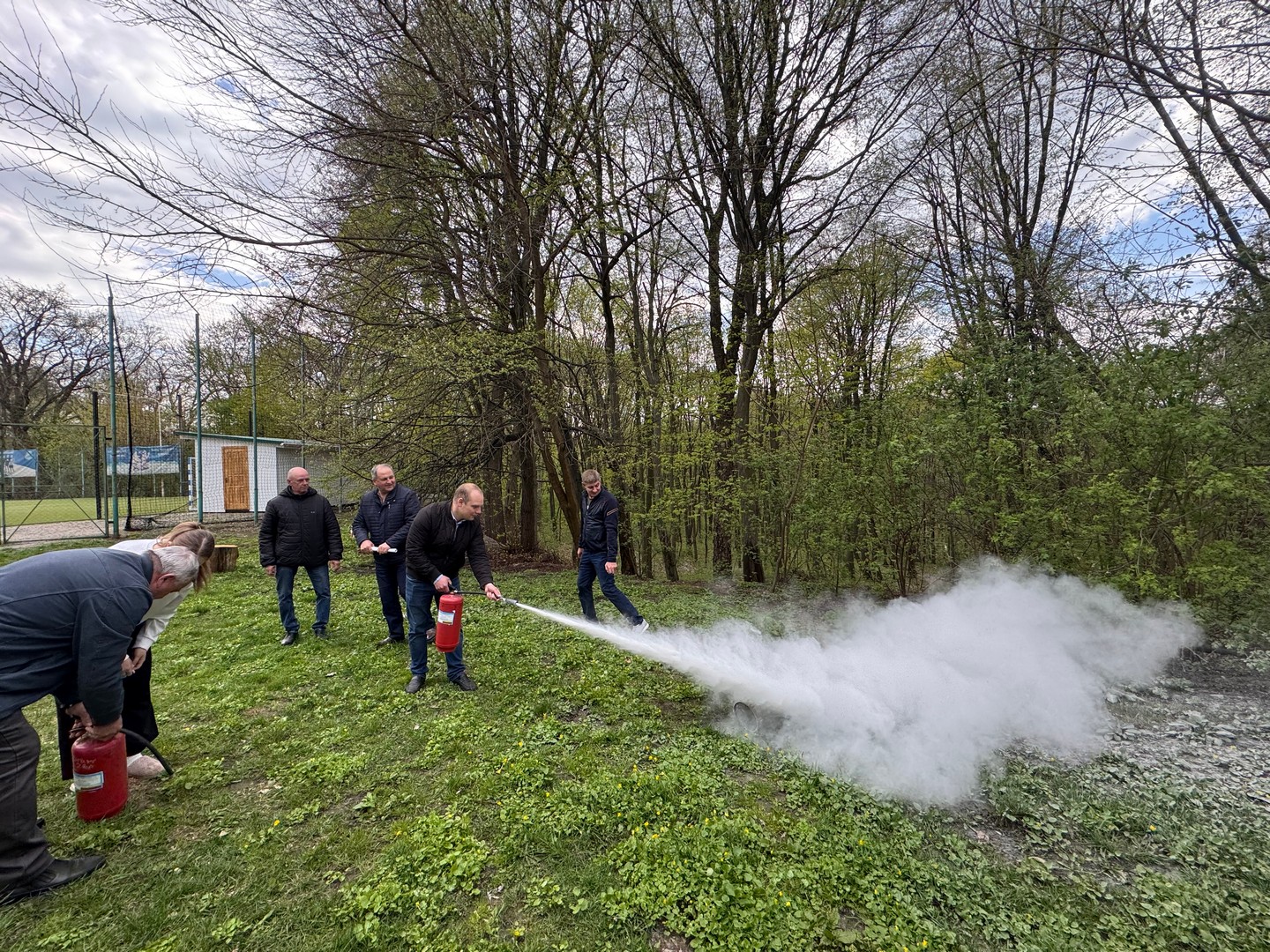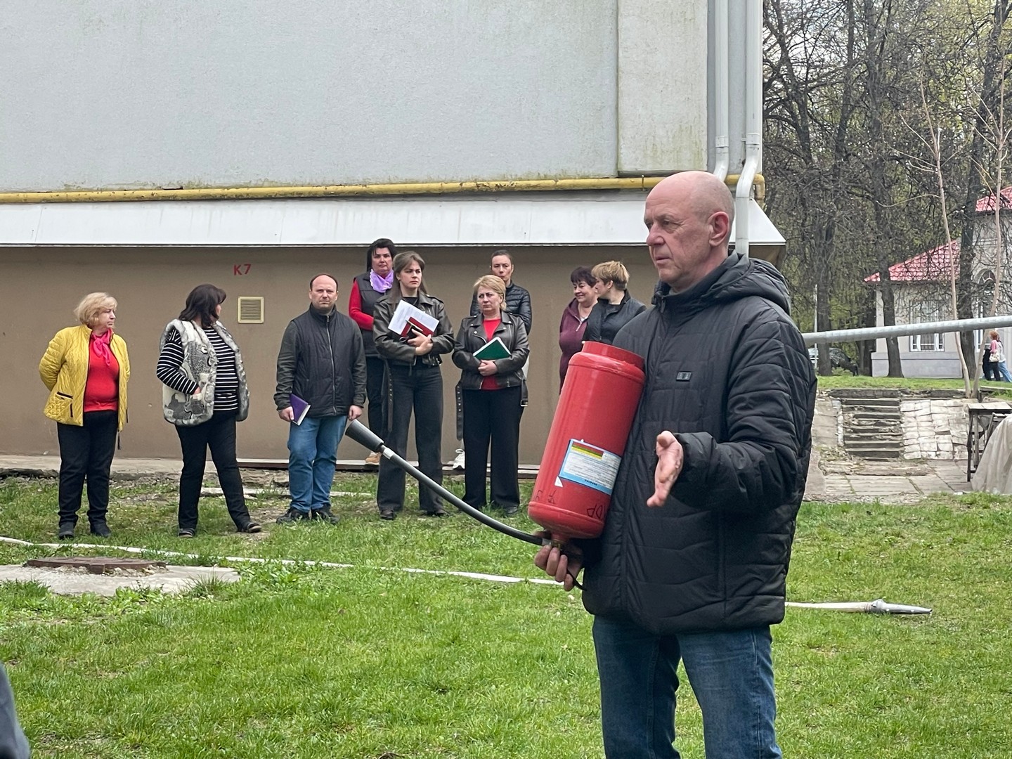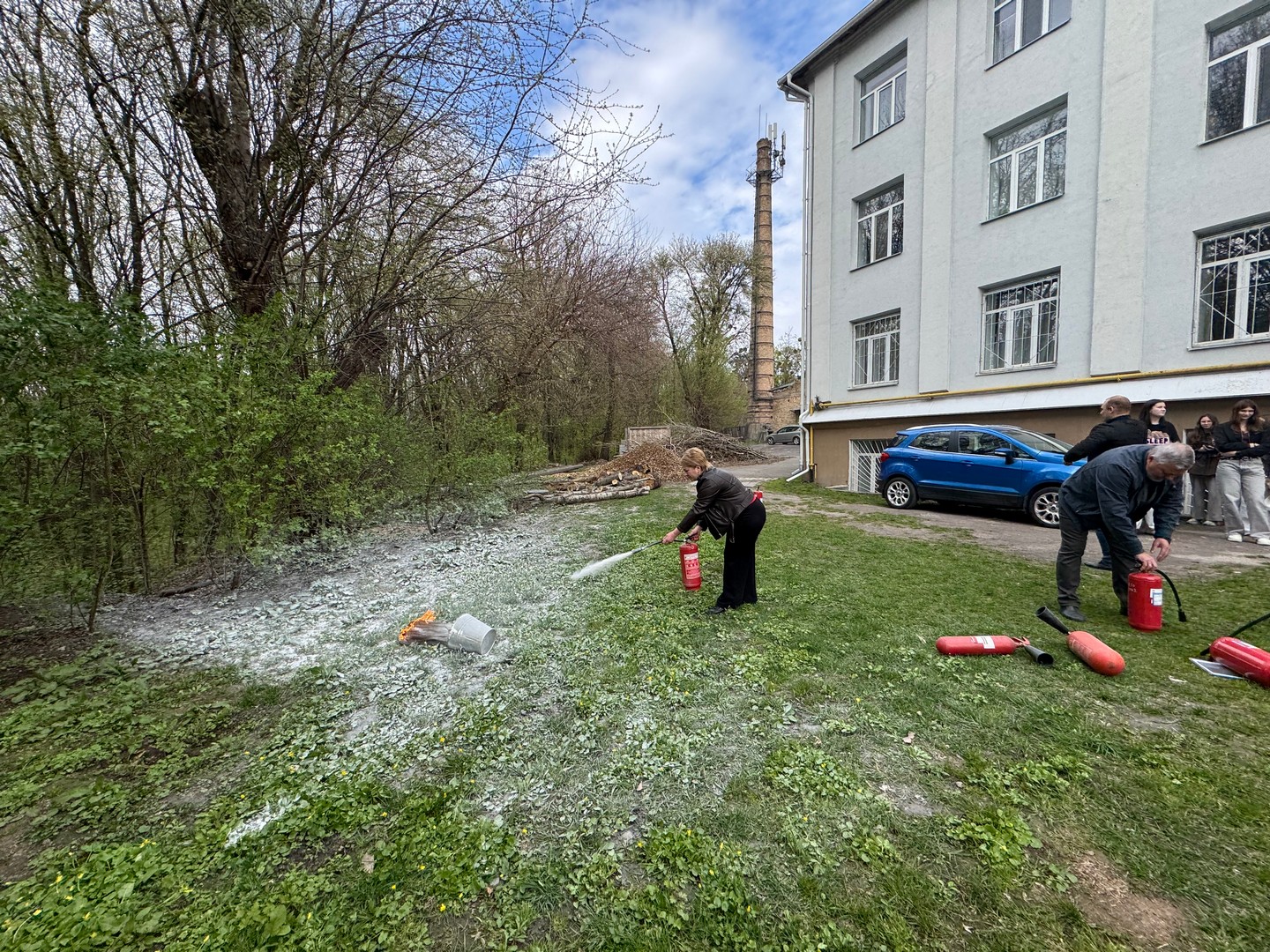 Третій етап був практичним і включав відпрацювання дій у разі виявлення підозрілого предмета в цокольному приміщенні, а також моделювання ситуації з блокуванням одного з евакуаційних виходів. Учасники продемонстрували злагоджену взаємодію під час організованої евакуації до визначеного місця збору. Окрему увагу приділили практичному використанню первинних засобів пожежогасіння: роботі з вогнегасниками, пожежними рукавами та комплектами.