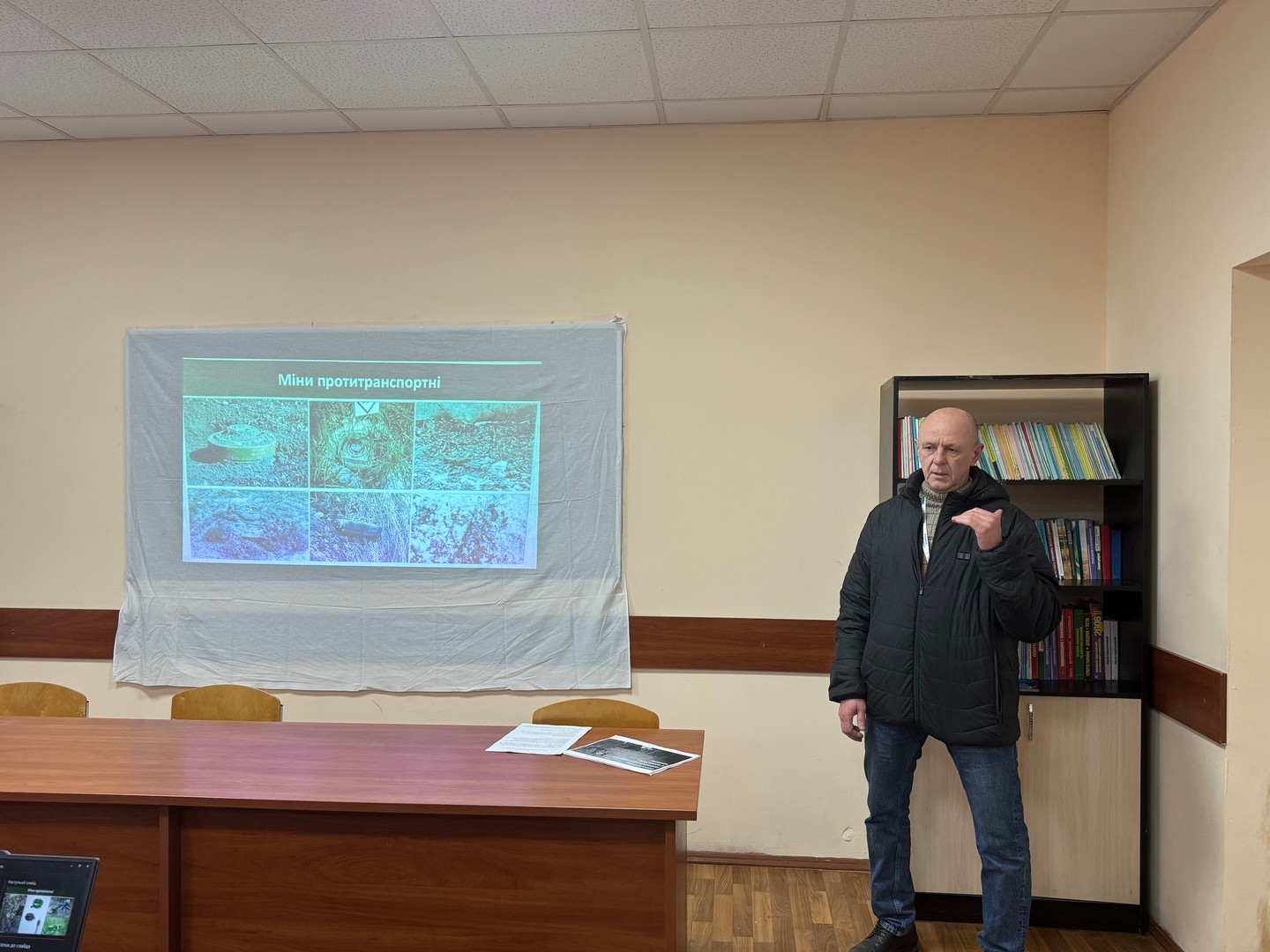 Другий етап мав теоретичний характер і відбувався в читальному залі. Учасники прослухали лекції щодо порядку дій у разі надзвичайних ситуацій, переглянули навчальні матеріали. Інструктор з навчання ризикам, пов’язаним із вибухонебезпечними предметами Олександр ДЕРЕВЯ’НКО (представник міжнародної організації з гуманітарного розмінування), ознайомив присутніх із видами небезпечних предметів та правилами поводження з ними, продемонстрував наочні зразки.