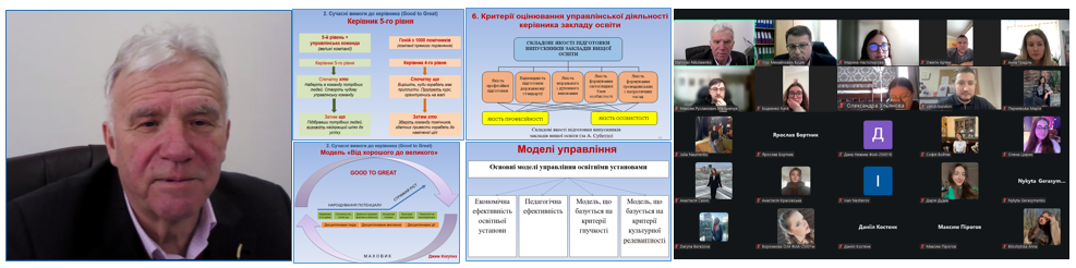 Нині освітній процес в університеті активно проходить у дистанційну форматі. Сьогодні майбутні освітяни-управлінці, заповнили віртуальну лекційну аудиторію для вивчення актуальної теми, яка висвітлювала питання історії виникнення науки управління, сучасних вимог до керівника, законів самоуправління, самоменеджменту, тайм-менеджменту у діяльності керівника закладу освіти, управлінської діяльності керівника, моделей управління освітніми установами, організації праці, робочого місця та організаційних формам управління, критеріїв оцінювання управлінської діяльності та планування роботи закладу освіти.