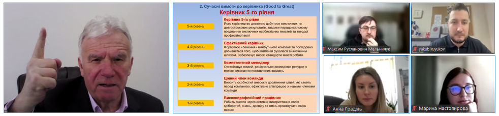 Професор Станіслав Ніколаєнко структурно поєднував сучасні вимоги до керівника у змісті лекції із представленням та тлумаченням теоретичних наукових положень із практичними рекомендаціями та реальними прикладами з управлінської освітянської діяльності. Протягом усього заняття студенти були активними учасниками навчального дійства, вступали з лектором у продуктивну дискусію, ставили актуальні запитання, доповнювали, обґрунтовано висловлювали власні думки і позиції.