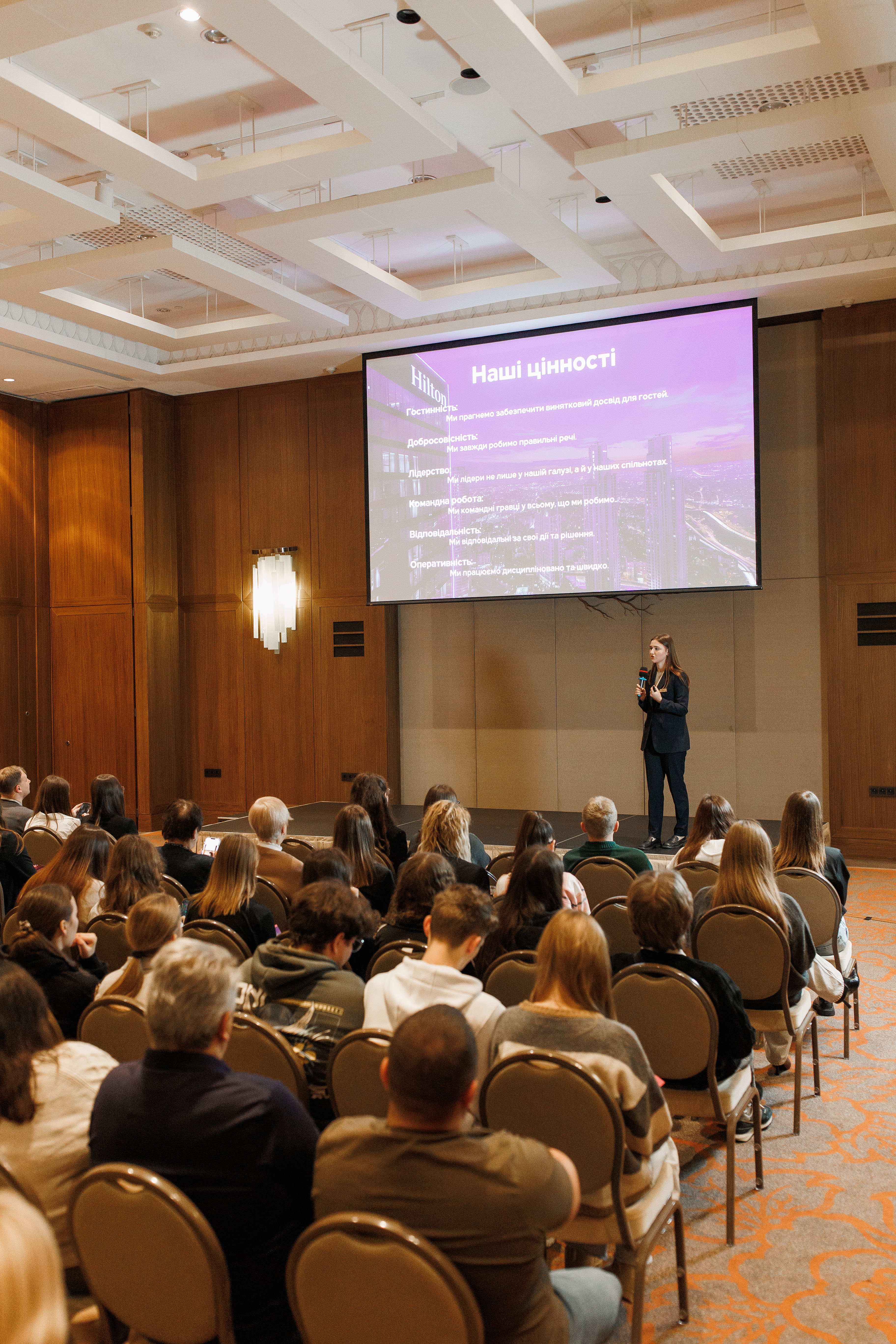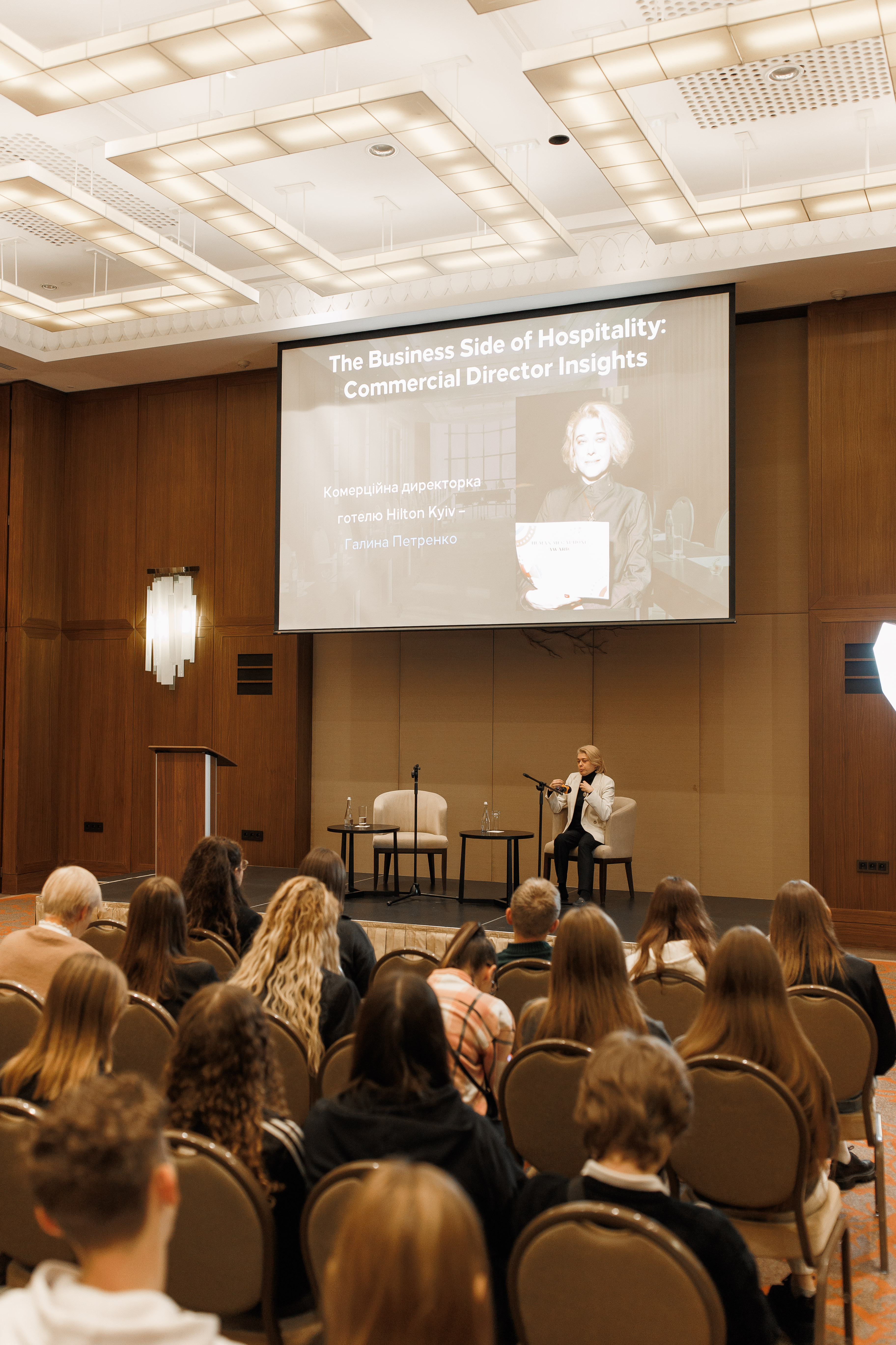 У межах заходу відбулася серія лекцій від керівників підрозділів готелю. Галина ПЕРЕПЕЛИЦЯ, комерційна директорка Hilton Kyiv, виступила з доповіддю «The Business Side of Hospitality: Commercial Director Insights», окресливши комерційні механізми управління готелем, особливості роботи з клієнтськими сегментами та стратегічні підходи до формування доходів.