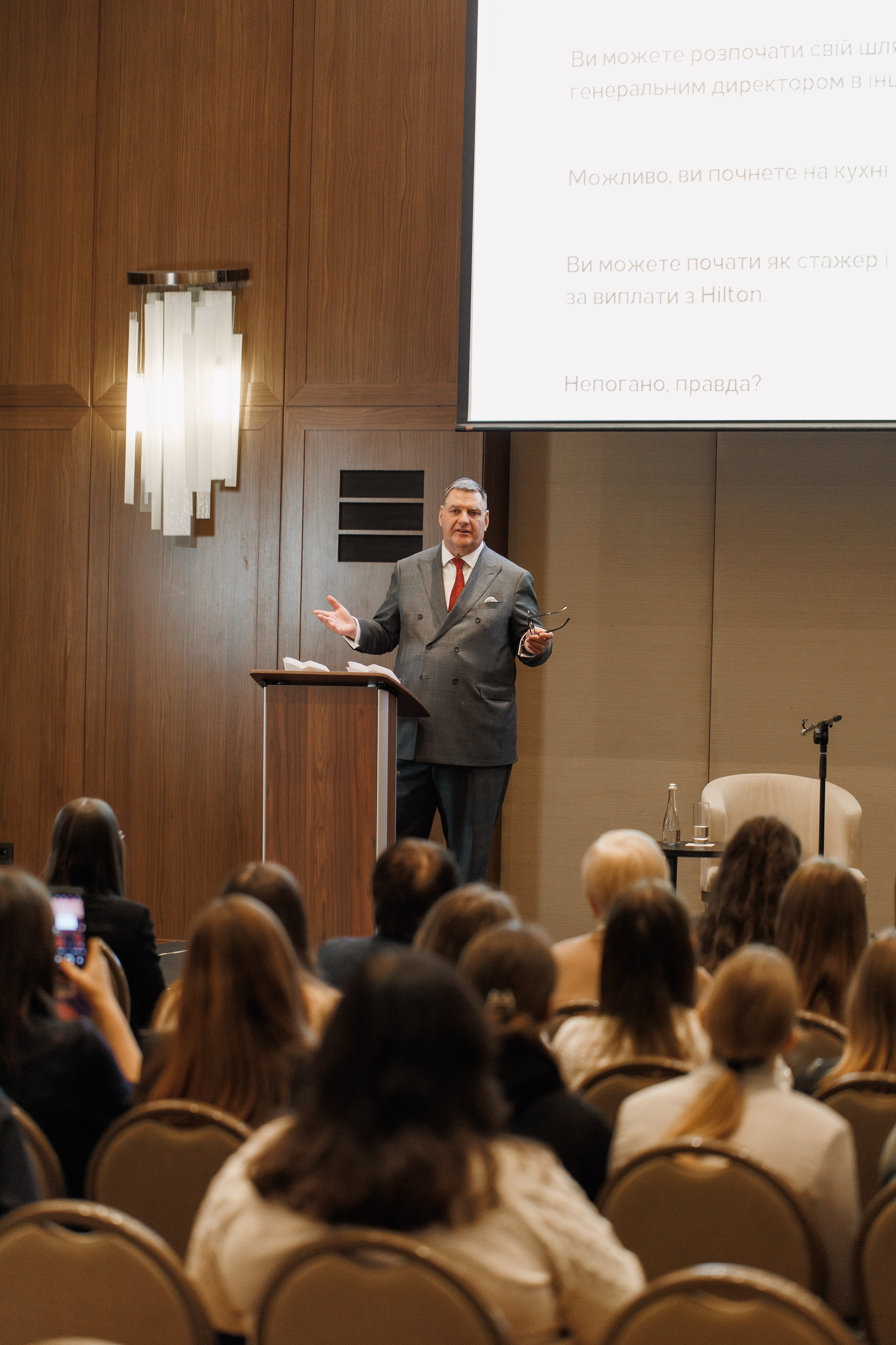 Особливою частиною програми став виступ генерального директора Hilton Kyiv Кріса НАССЕТТА який поділився зі студентами сучасним баченням управління міжнародним готельним брендом. Він розповів про глобальні стандарти Hilton, принципи формування сервісної культури та ключові компетентності, яких потребує індустрія гостинності сьогодні. Кріс Нассетт наголосив на важливості інновацій, екологічної відповідальності та емоційного сервісу, а також відповів на запитання студентів про можливості стажувань, кар’єрні траєкторії та виклики у роботі великих готельних мереж.