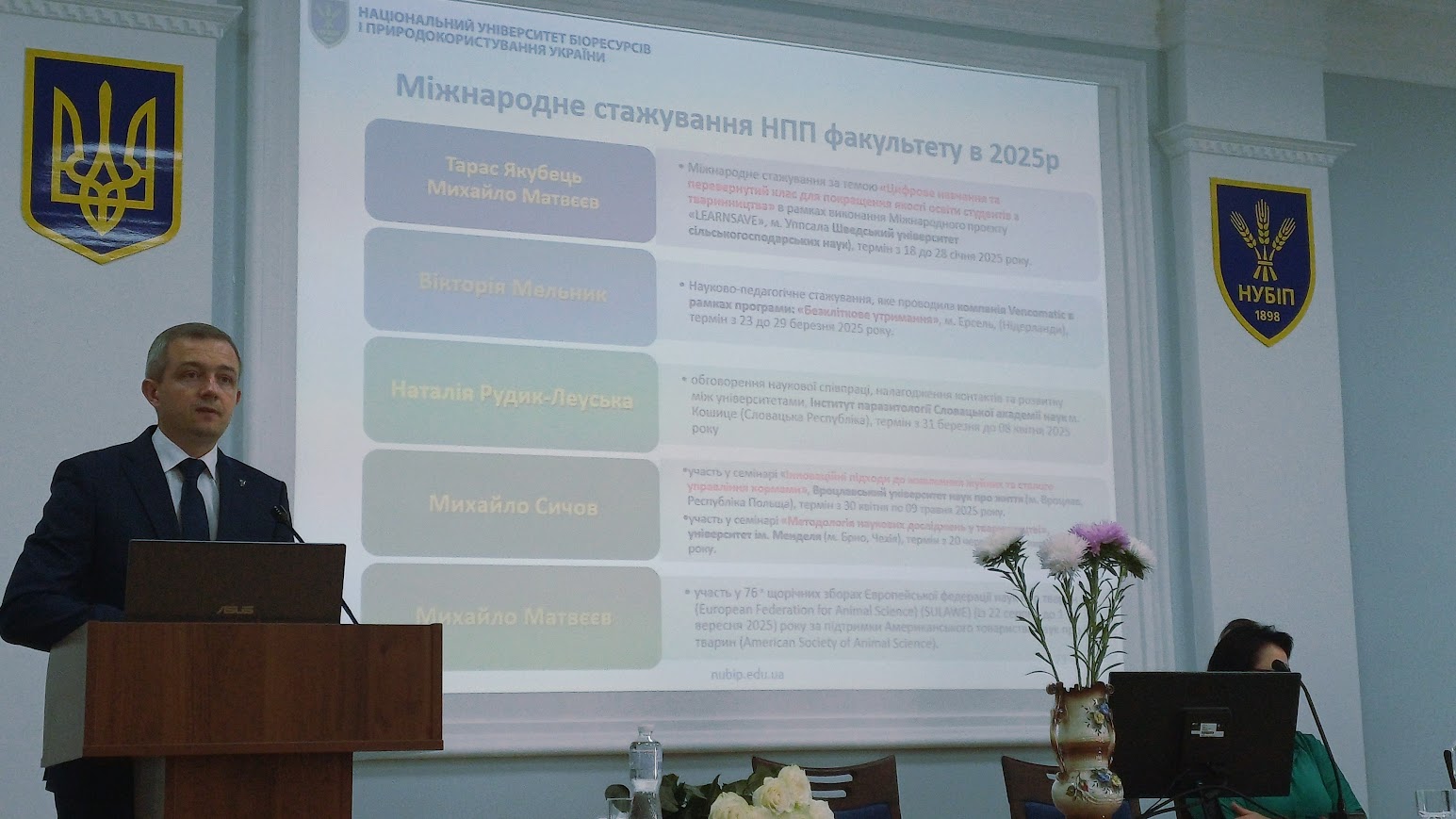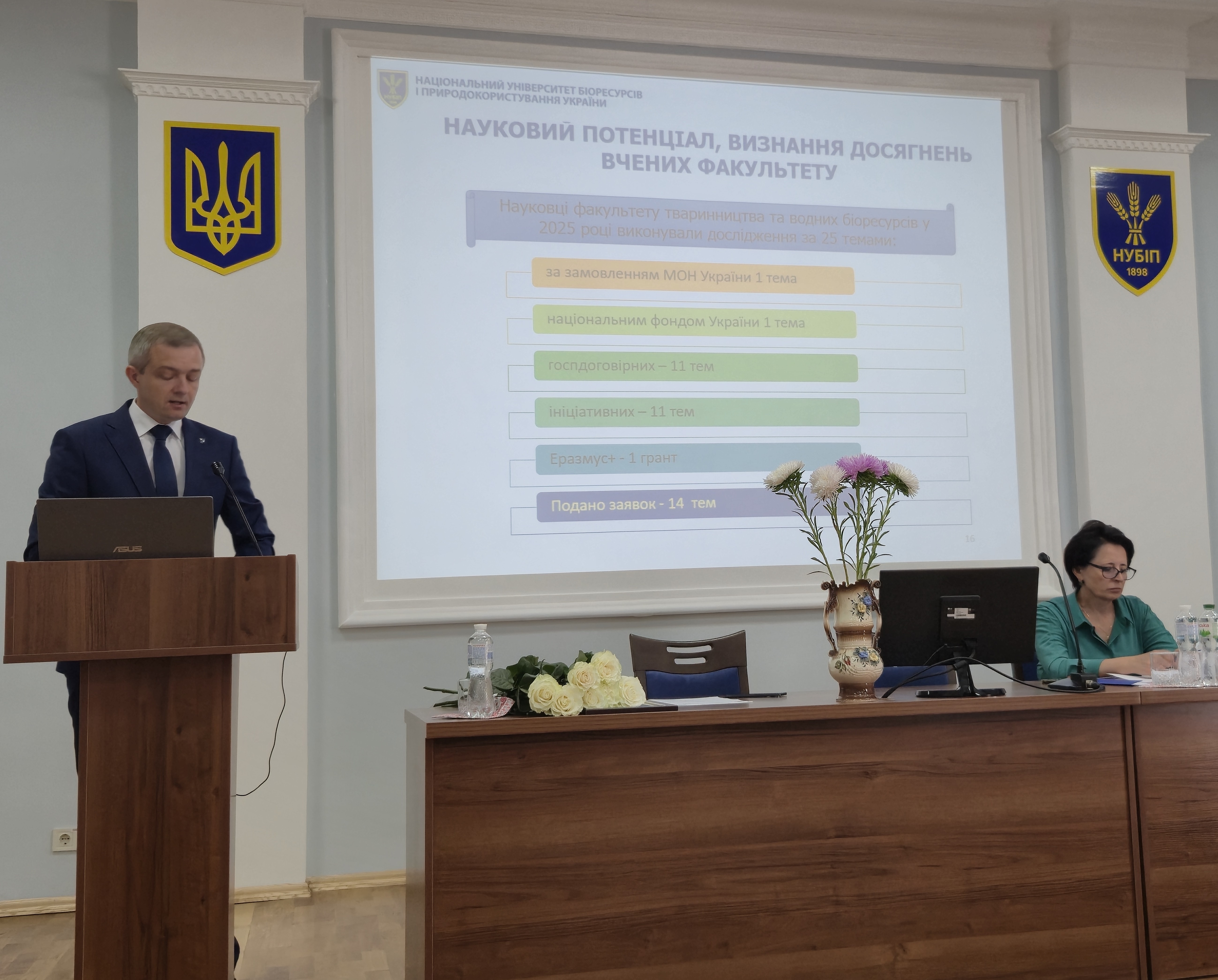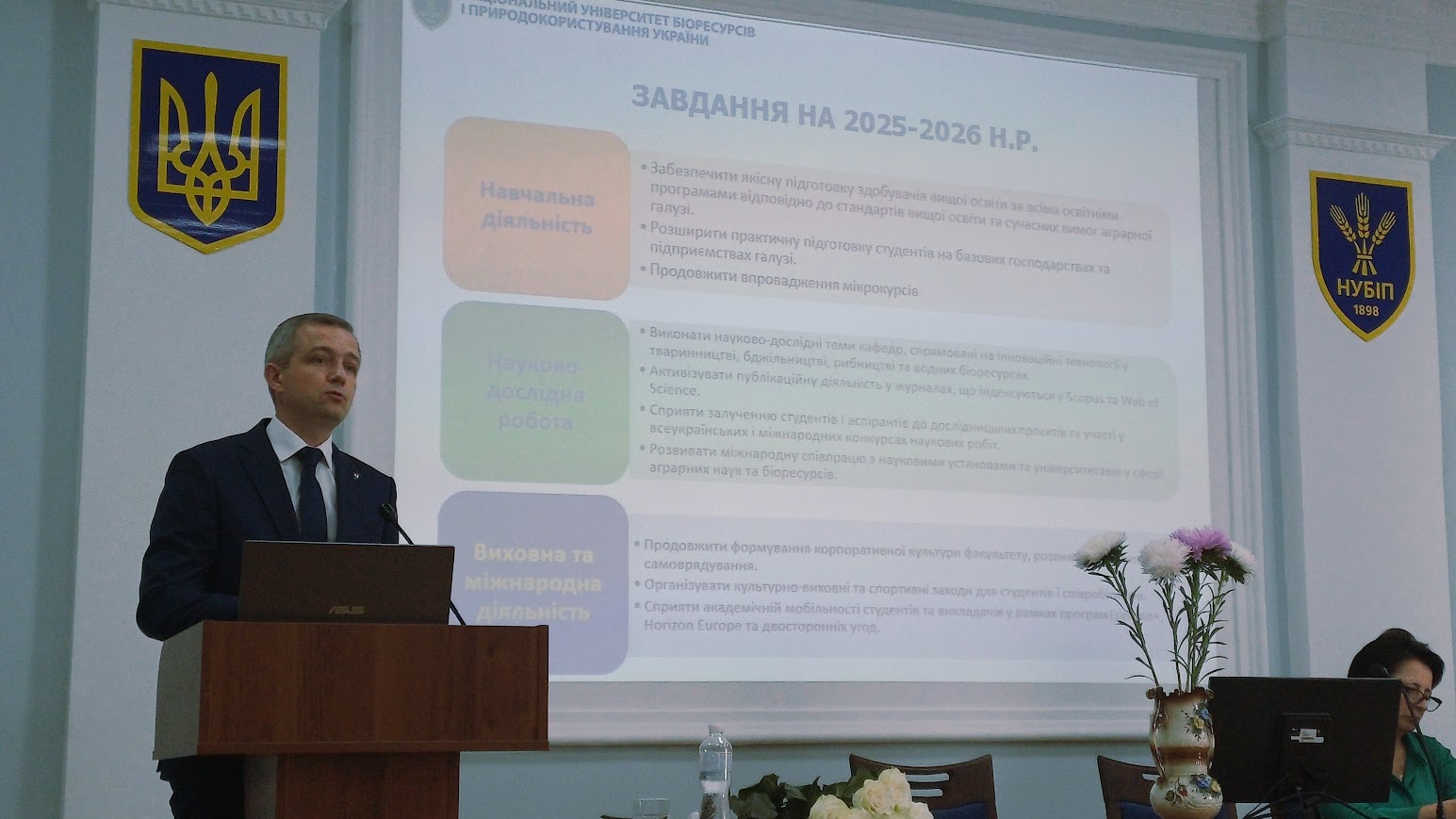 З доповіддю про наукову діяльність факультету та план роботи на 2025–2026 навчальний рік виступив директор НДІ технологій та якості продукції тваринництва Дмитро Уманець.