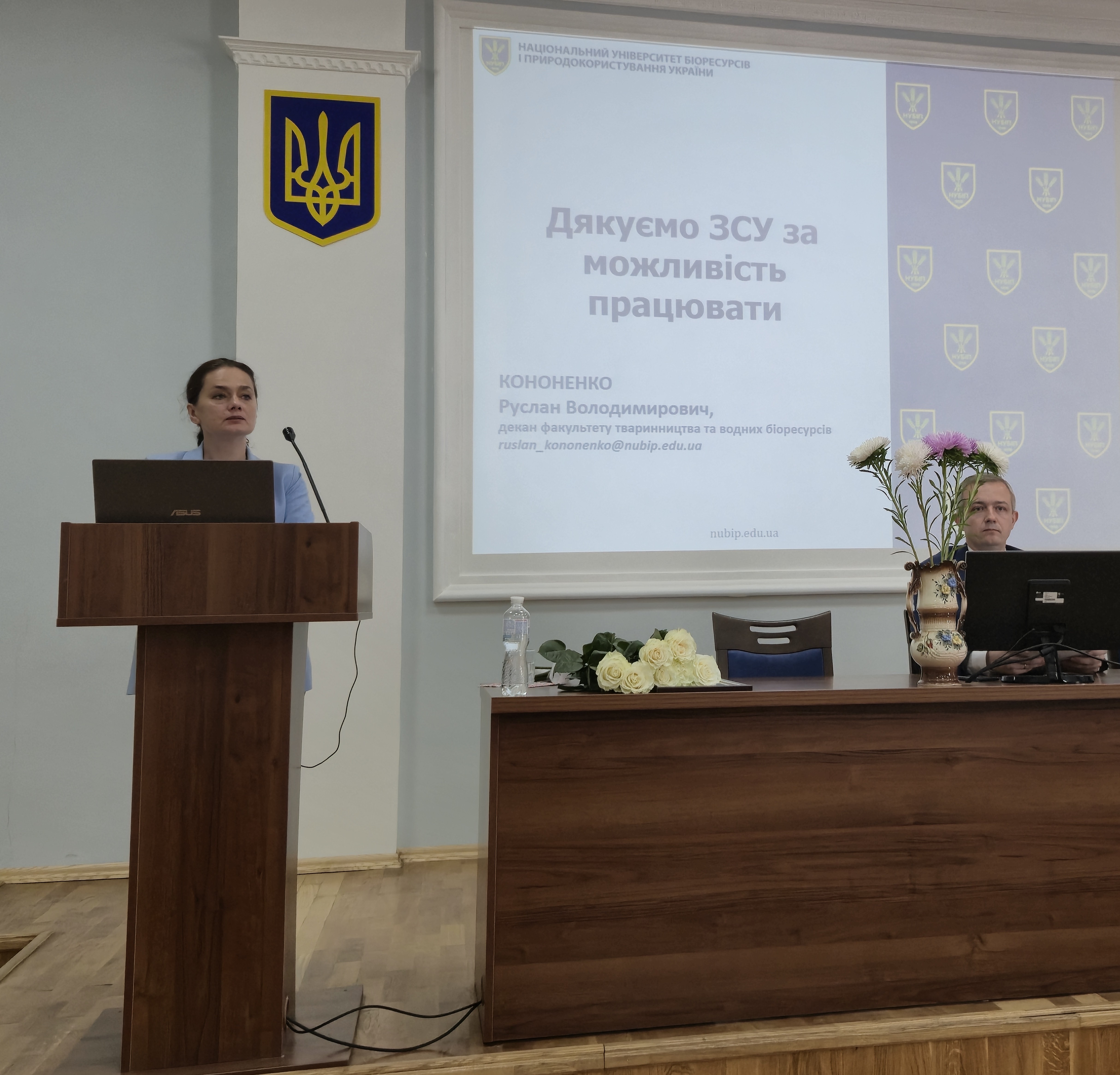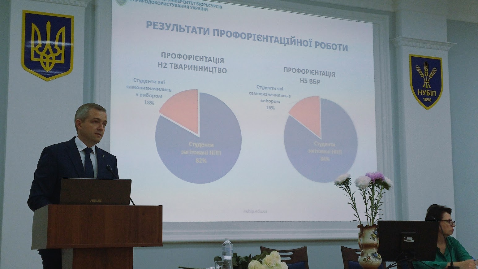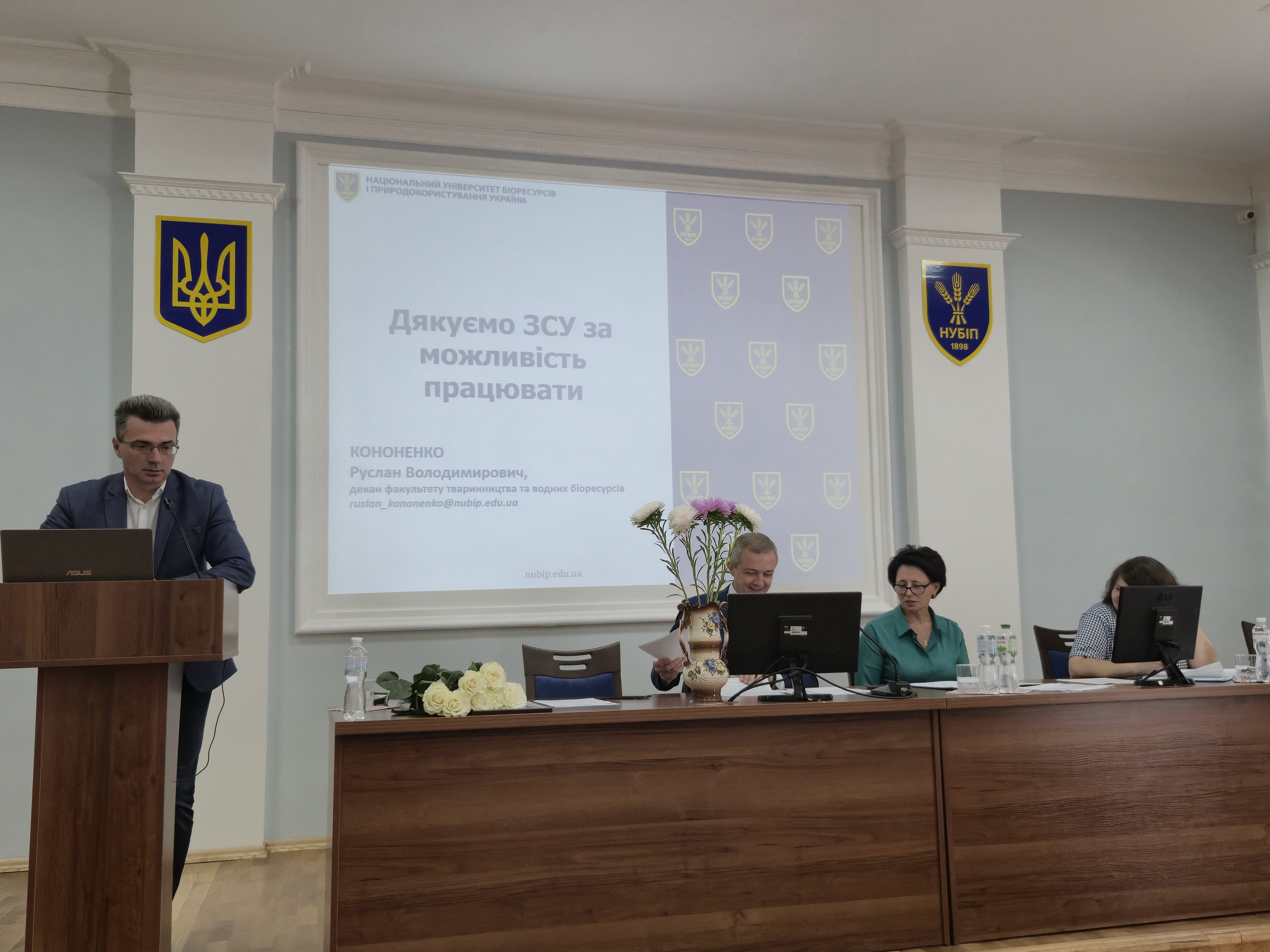 Серед досягнень: введення в дію наукової лабораторії «Геноміки та транскриптоміки», завершення ремонтних робіт у проблемній лабораторії кормів та кормових добавок, капітальний ремонт 33 кімнат у гуртожитку № 11 (ще 8 перебувають у стадії ремонту). Особливу увагу доповідач звернув на складні умови цьогорічної вступної кампанії. Завершуючи виступ, Руслан Кононенко підкреслив, що кожен науково-педагогічний працівник має постійно вдосконалюватися, бути професіоналом своєї справи та пишатися своєю роботою.