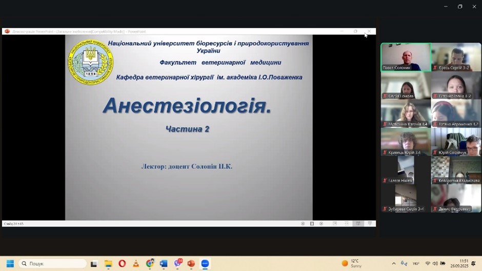 У п’ятницю, 26 вересня 2025 року, на кафедрі ветеринарної хірургії імені академіка І.О. Поваженка на 3 парі Солонін Павло Костянтинович провів відкриту лекцію з дисципліни "Оперативна хірургія топографічна анатомія та анестезіологія" для студентів 3 курсу 1-4 груп ОС «Магістр», спеціальність 211 «Ветеринарна медицина», на тему «Анестезіологія частина 2. Підготовка тварини до наркозу. Наркоз окремих видів тварин». Після завершення лекції колектив кафедри провів її обговорення. Науково-педагогічні працівники, які були присутні на відкритій лекції, одноголосно відзначили її високий рівень.