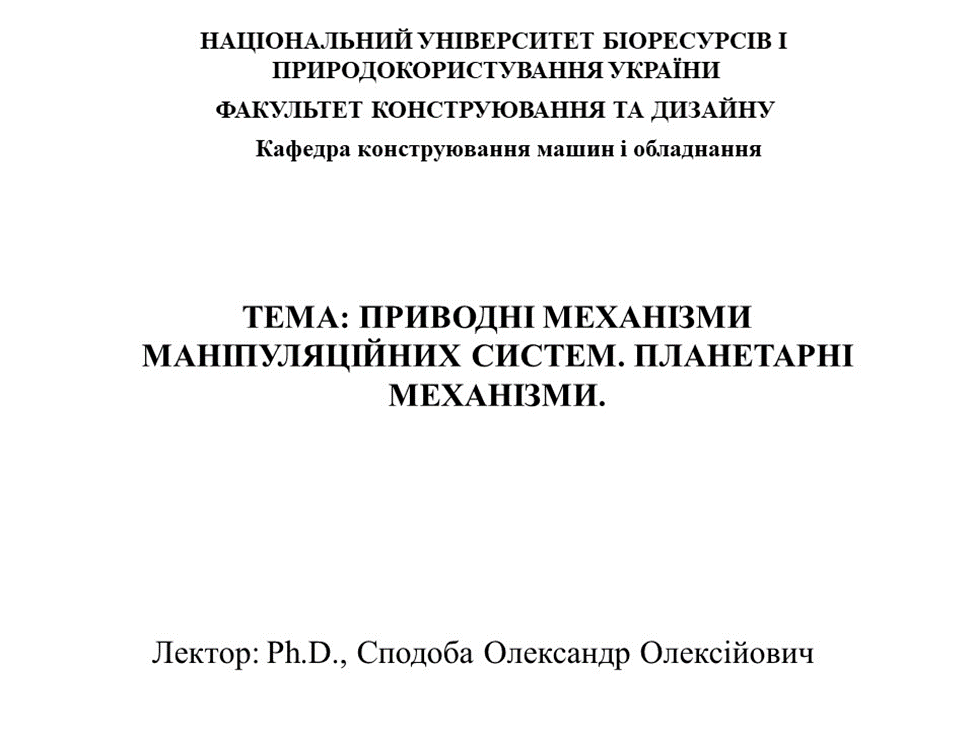 На лекції було висвітлено питання використання та розрахунку різних типів планетарних механізмів які використовуються в маніпуляційних системах. як у сільськогосподарському виробництві, так і в галузевому машинобудуванні у цілому.