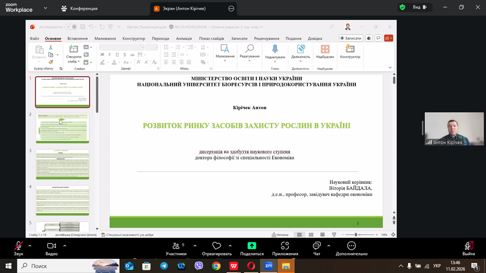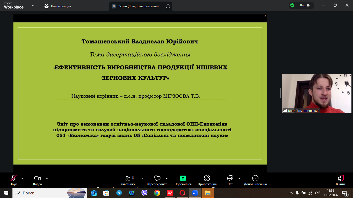 11 лютого 2026 року на кафедрі економіки в форматі онлайн відбулося чергове робоче засідання. На порядку денному було питання надання висновку кафедри щодо допуску до попередньої експертизи дисертацій аспірантів Антона КІРІЧЕКА та Владислава ТОМАШЕВСЬКОГО.