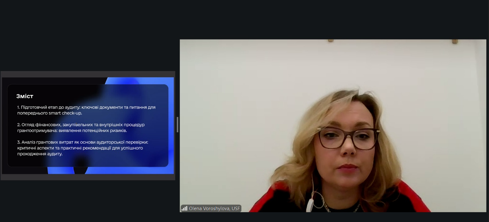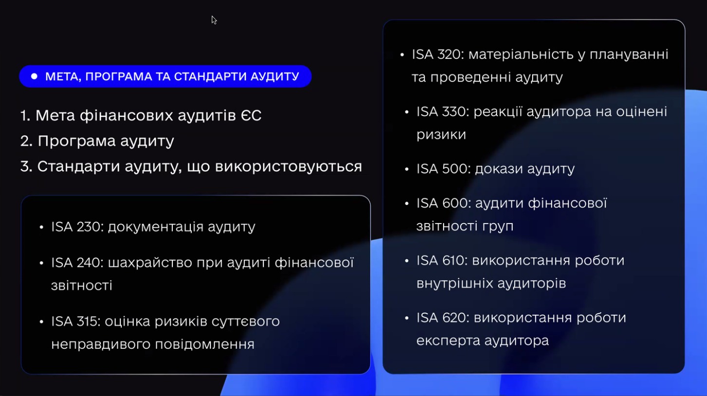 Говорячи про підготовку до аудиту, спікерка наголосила, що ключем до успіху є системність. Аудит має на меті перевірку задекларованих витрат та їх відповідність як національному законодавству, так і вимогам грантодавця. При цьому всі процедури здійснюються відповідно до міжнародних стандартів аудиту. Саме тому надзвичайно важливо не обмежуватися умовами основного тексту грантової угоди, а ретельно опрацьовувати всі додатки та супровідні документи. Рекомендовано також мати анотовану версію грантової угоди — як робочий інструмент для команди проєкту.
