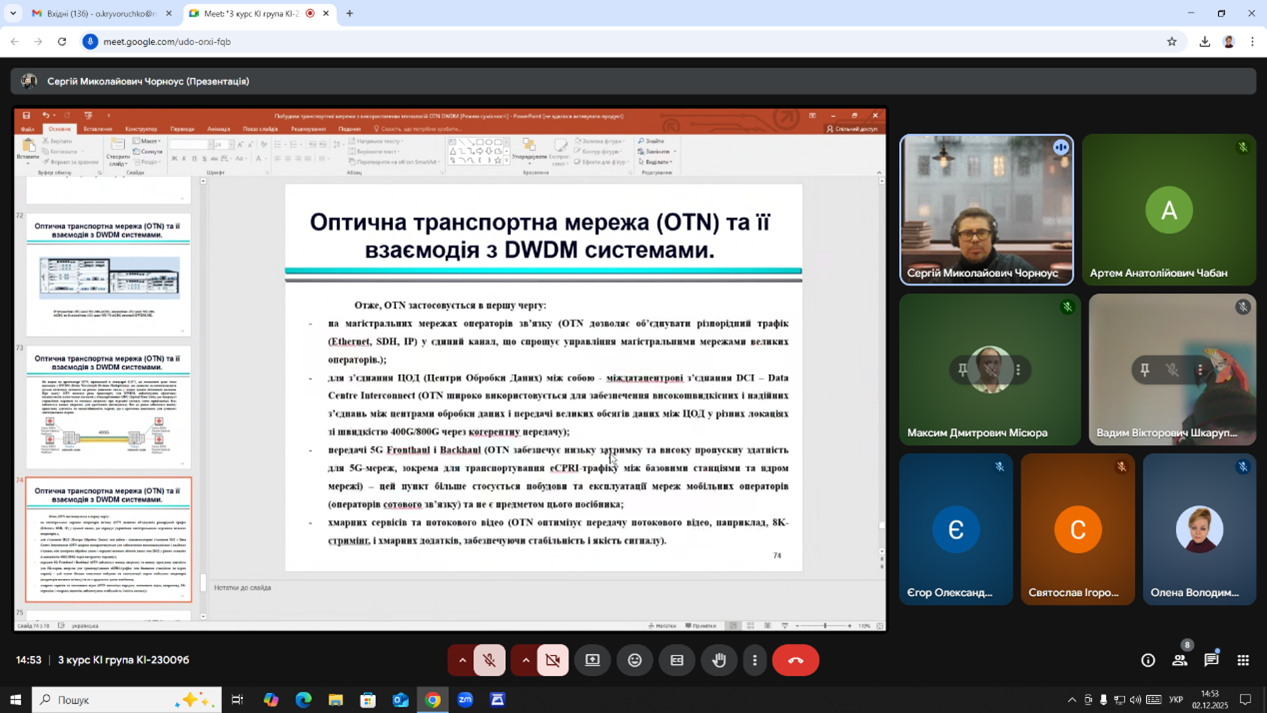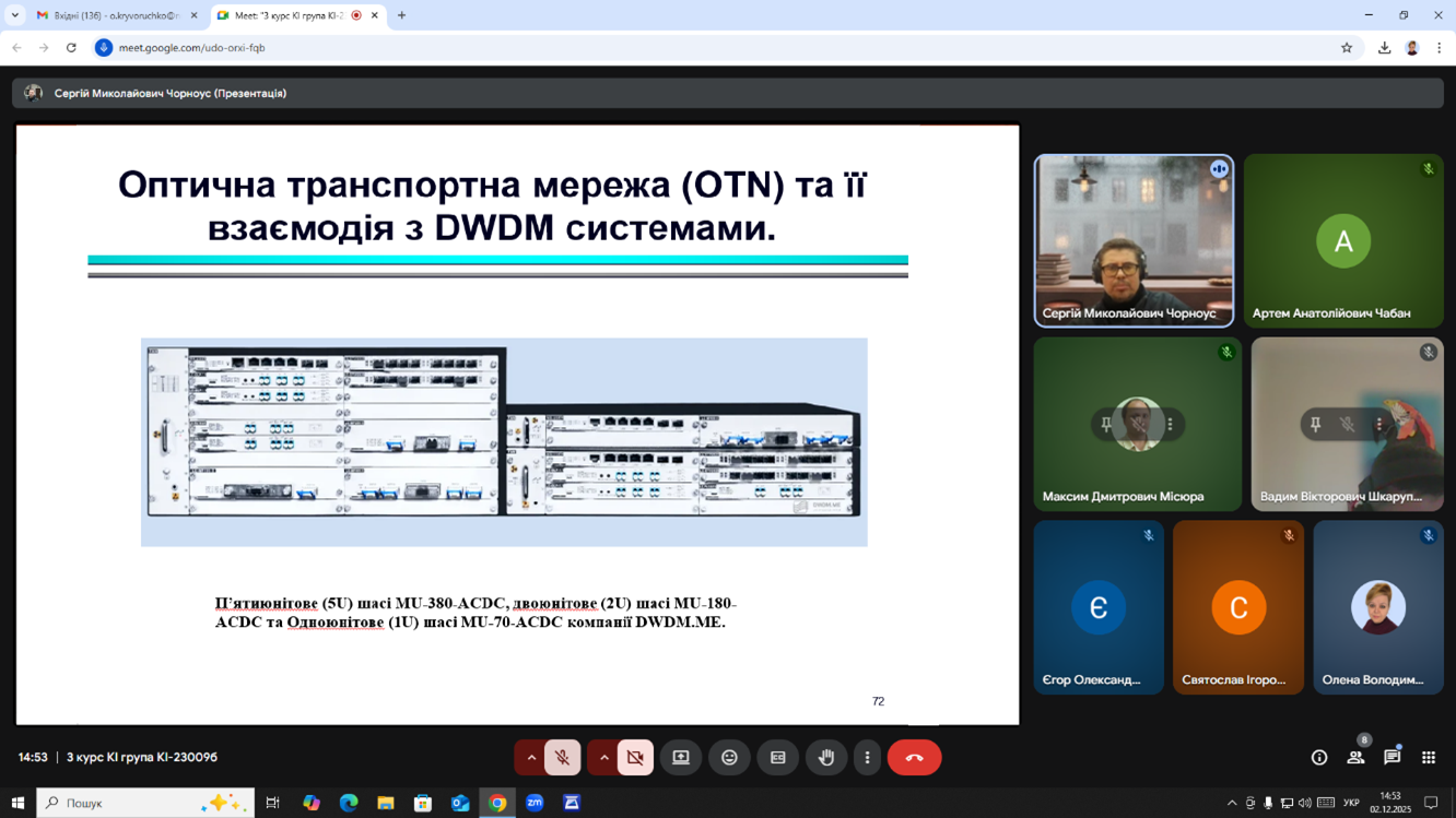 Лекція розпочалася з короткого огляду теорії волоконно-оптичних систем. Студенти активно долучились до обговорення – надавали відповіді в чаті. Далі було розглянуто основні питання лекції, а саме принципи побудови мереж OTN та їх інтеграція з технологією спектрального ущільнення DWDM.