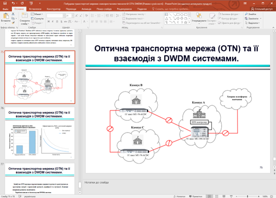 Розглядаючи питання побудови мереж OTN-DWDM особлива увага була зосереджена на ключових перевагах побудови сучасних магістральних мереж з використанням обладнання спектрального мультиплексування, наведені приклади побудови мережі закладів вищої освіти з використанням обладнання DWDM.ME.
