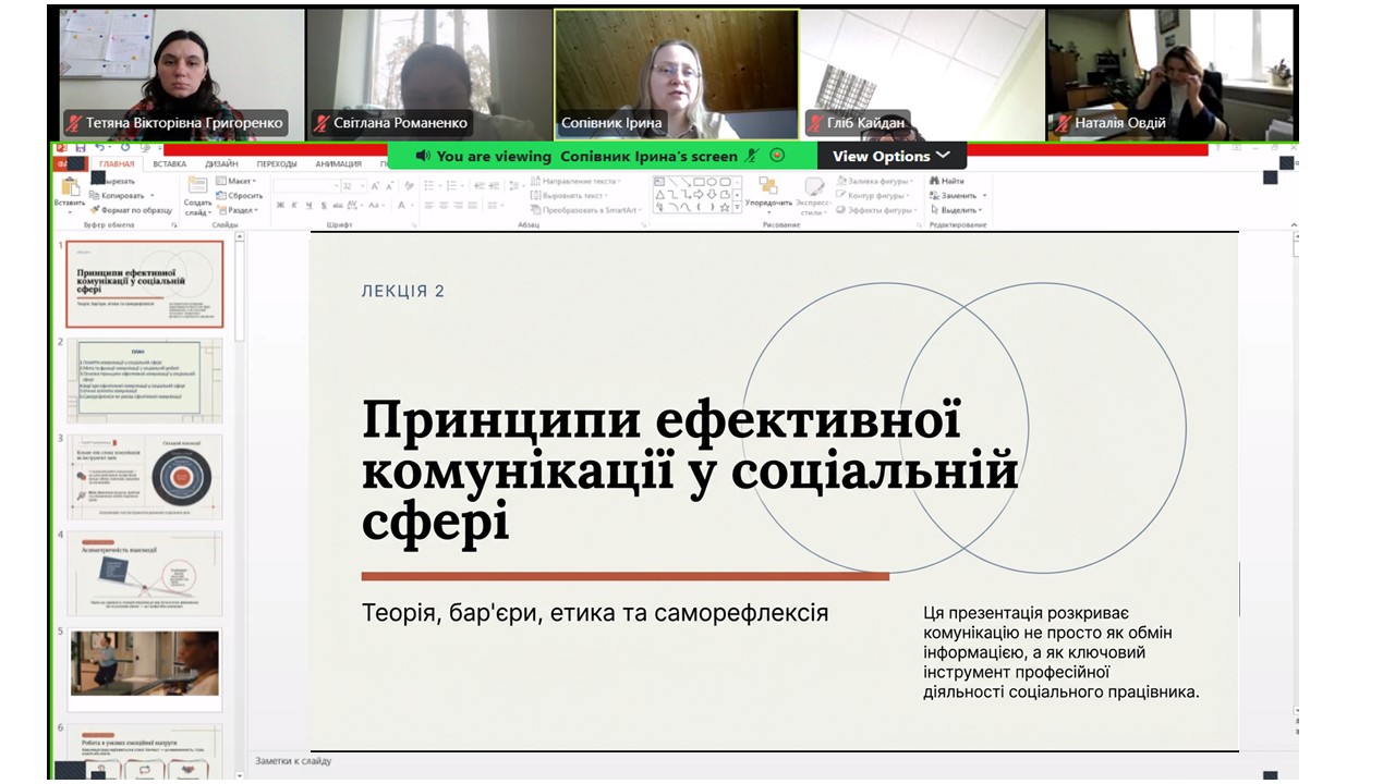 У сучасних умовах соціальний працівник – це не лише фахівець із надання послуг, а й комунікатор, адвокат інтересів клієнтів, представник професії в публічному просторі. Саме з цього акценту розпочалося заняття. Ірина Віталіївна наголосила, що публічність у соціальній сфері - це не самореклама, а інструмент формування довіри, прозорості діяльності та підвищення соціального авторитету професії. Лекція була побудована навколо трьох ключових векторів - професійна ідентичність у публічному просторі; етичні засади самопрезентації; цифрова репутація соціального працівника.