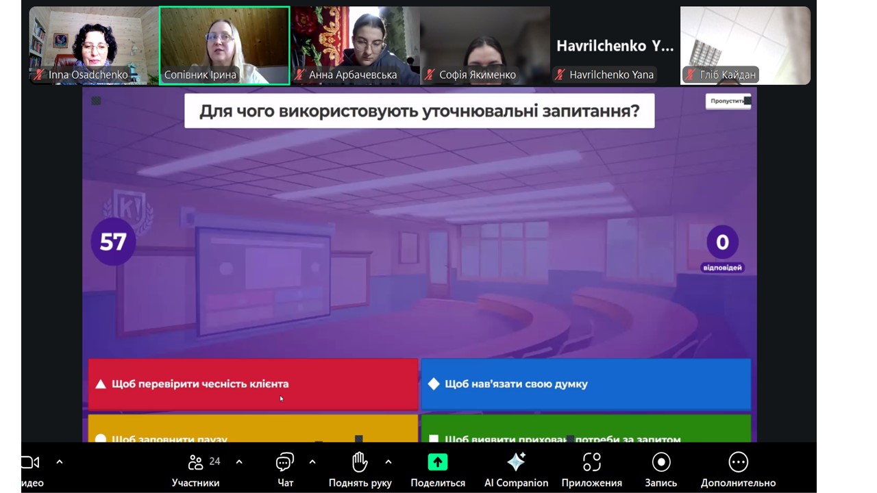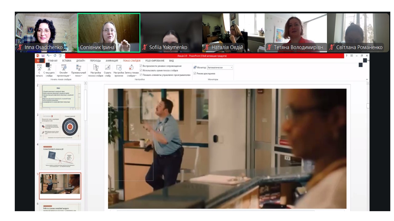 Дистанційний формат – сьогодні це не виклик, а інтерактивність та педагогічна майстерність. Лекція відбувалася на платформі Zoom із використанням мультимедійної презентації, інтерактивних опитувань та активного обговорення в чаті. Формат дистанційного навчання був використаний максимально ефективно, застосовано метод проблемно-орієнтованого викладу матеріалу; аналіз відеофрагментів; моделювання ситуацій професійної самопрезентації; організація міні-дискусій; залучення студентів до рефлексії щодо власної публічної ідентичності.