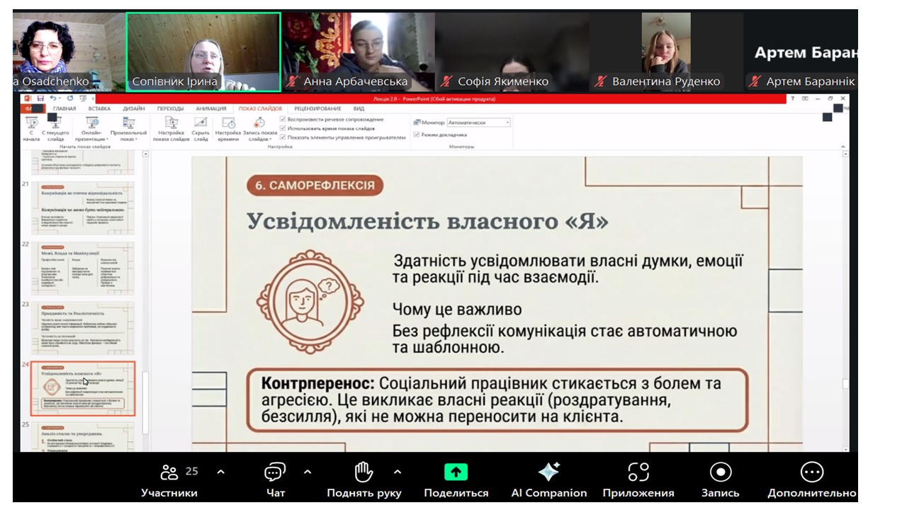 Високий професіоналізм Сопівник Ірини Віталіївни проявився у глибокій теоретичній підготовці, логічній структурі лекції та вмінні інтегрувати наукові підходи з актуальними викликами соціальної роботи. Лекторка продемонструвала системність мислення, чіткість формулювань, володіння сучасною термінологією та здатність переконливо аргументувати позиції. Водночас подання матеріалу залишалося доступним, динамічним і практикоорієнтованим. Особливістю заняття стала жива професійна рефлексія - Ірина Віталіївна не лише транслювала знання, а й показувала власний приклад публічної комунікації, академічної культури та лідерства.
