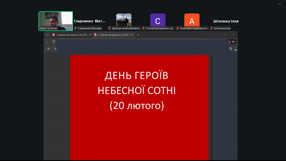 20 лютого студенти групи 1-ЗВ-3 факультету землевпорядкування долучилися до онлайн-зустрічі з куратором академічної групи з метою вшанування пам’яті Героїв Небесної Сотні. Ця дата є особливо важливою для українського народу, адже саме 20 лютого 2014 року відбулися найтрагічніші події Революції Гідності на Майдані Незалежності в Києві. У той день загинули десятки мирних протестувальників, які відстоювали демократичні цінності, свободу та право України на незалежний європейський розвиток.