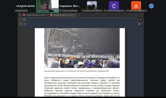 Під час зустрічі куратор Бутенко Євген Володимирович розповів про історичні передумови Революції Гідності, перебіг подій на Майдані та суспільні настрої того часу. Особливо цінними були його особисті спогади про те, як він застав ці події, які переживання відчували люди та наскільки важливою була підтримка і єдність українців.