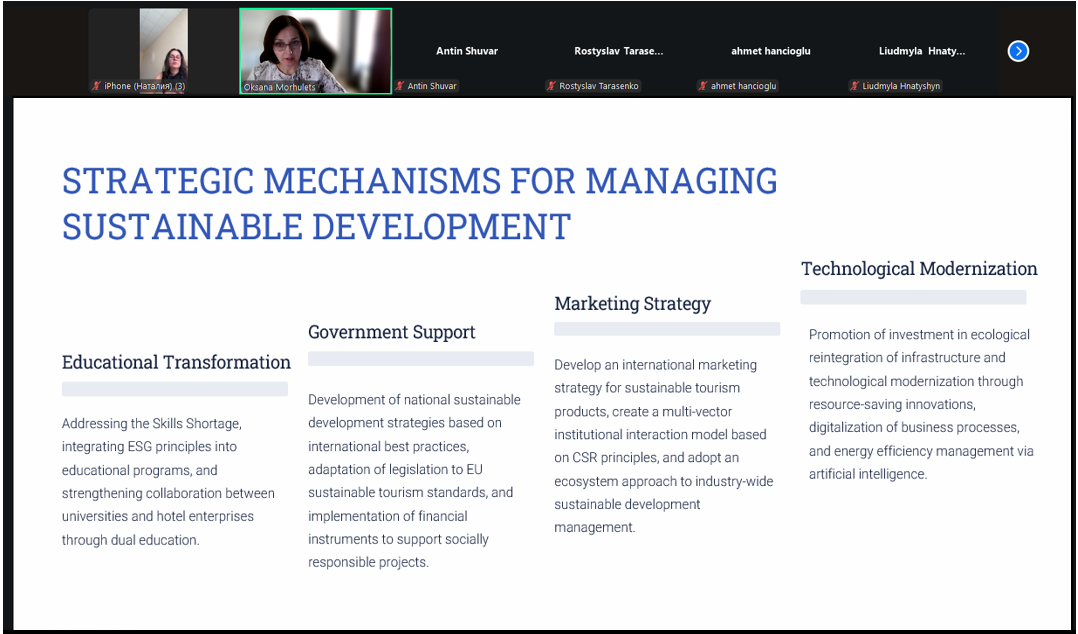 Виступ професора кафедри Оксани МОРГУЛЕЦЬ на тему «STRATEGIC MECHANISMS FOR MANAGING SUSTAINABLE DEVELOPMENT HOSPITALITY INDUSTRY IN UKRAINE» (співавтором доповіді є доцент Наталія БУНТОВА) присвячено глобальним трендам розвитку індустрії гостинності та аналізу її сучасного стану, а також визначенню ключових механізмів сталого розвитку галузі. Принципово важливим є формування нової парадигми сталого розвитку, яка передбачає системну трансформацію управлінських, технологічних, соціальних і правових підходів.