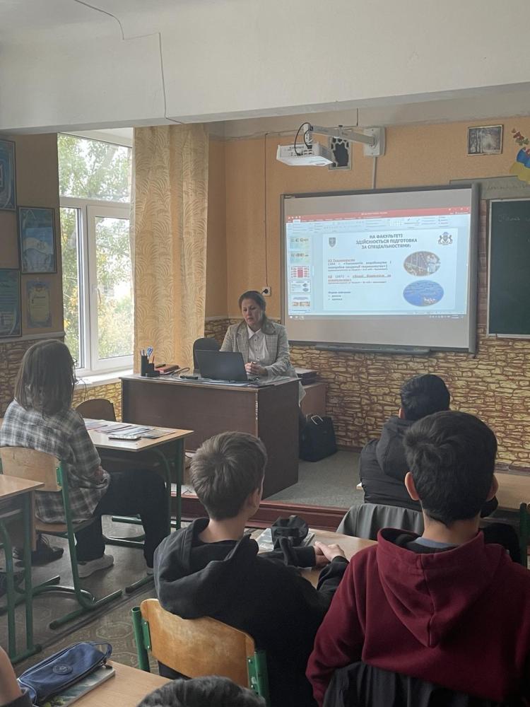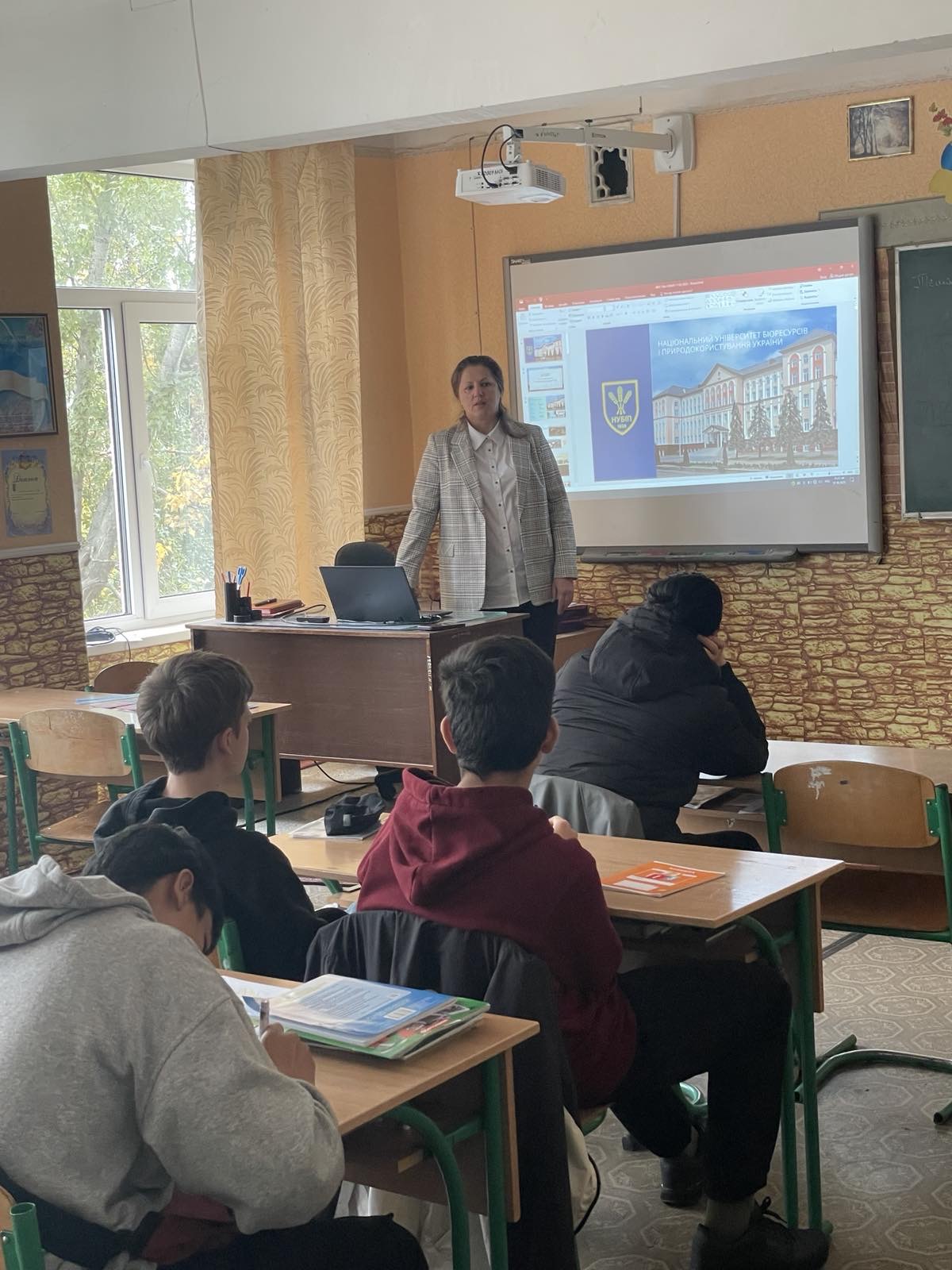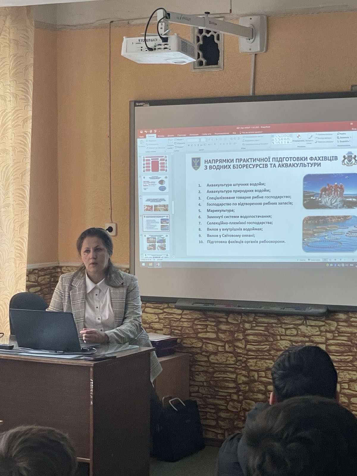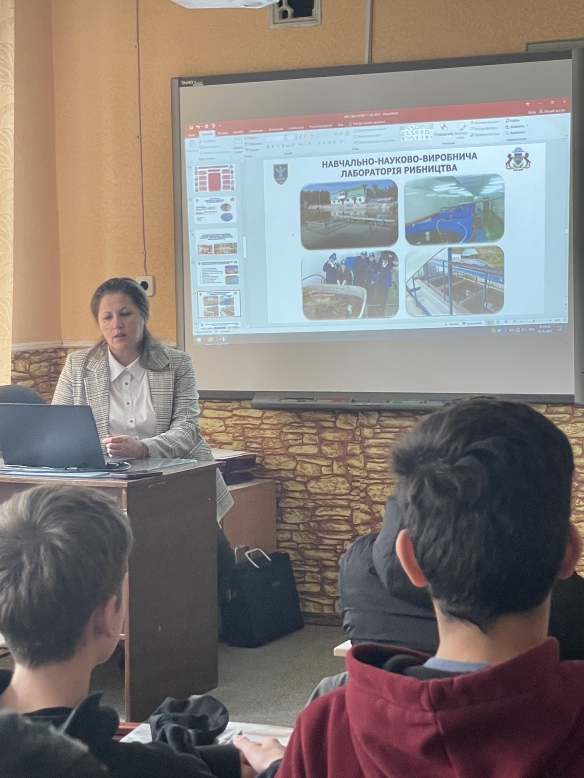 Під час зустрічі з учнями школи велику зацікавленість виявила презентація нашого університету, що ознайомила учнів зі різними спеціальностями зокрема і з Н5 Водні біоресурси та аквакультура. Різноманіття та кількість освітніх компонентів, що дають змогу закласти фундамент знань та створення сучасних прогресивних кейсів для висококваліфікованих спеціалістів у сфері рибогосподарської галузі.