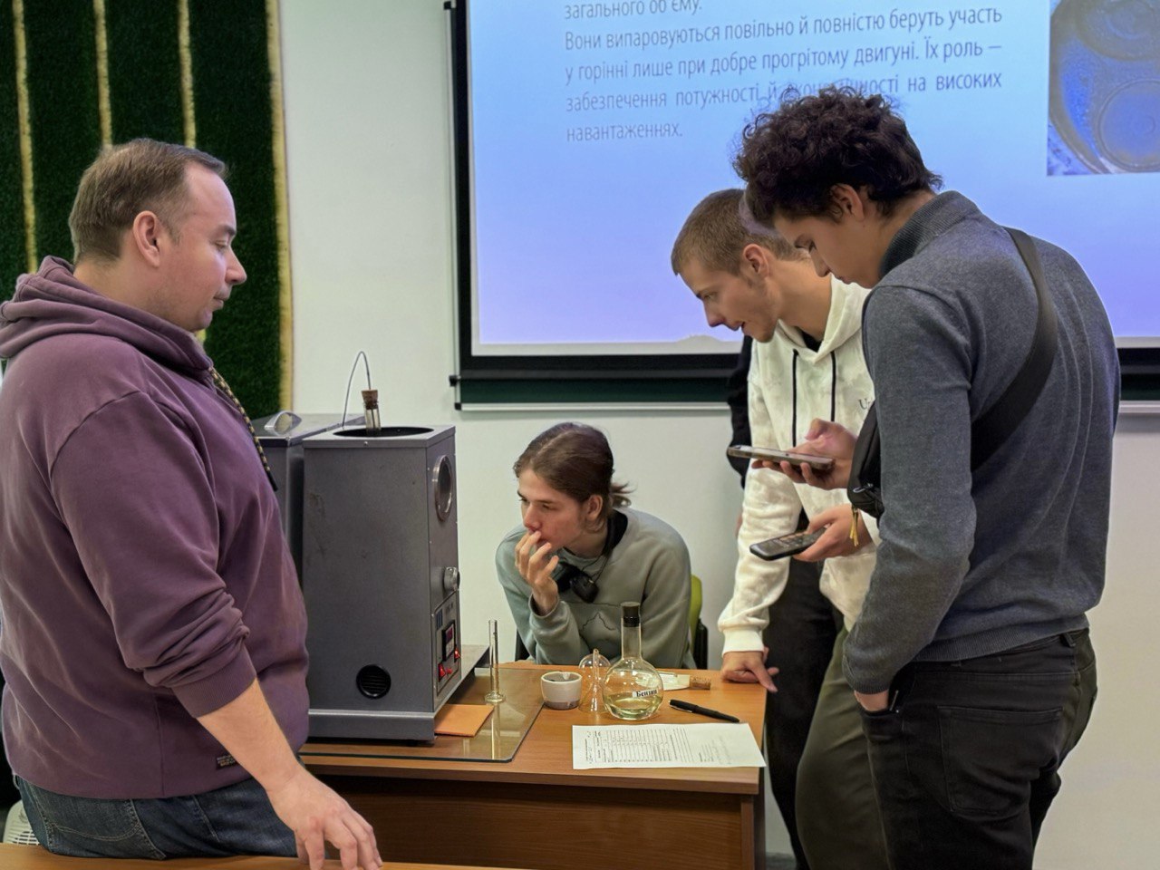 Захід розпочався з теоретичної частини, яку провів завідувач кафедри, доктор технічних наук, професор Євген КАЛІНІН. За допомогою мультимедійної презентації він детально розповів учням про основні характеристики палива, його якість та вплив на роботу двигуна та екологічні показники. Професор наголосив на важливості технічних знань для юних науковців і водночас продемонстрував, як сучасні технології допомагають аналізувати склад і властивості палива.