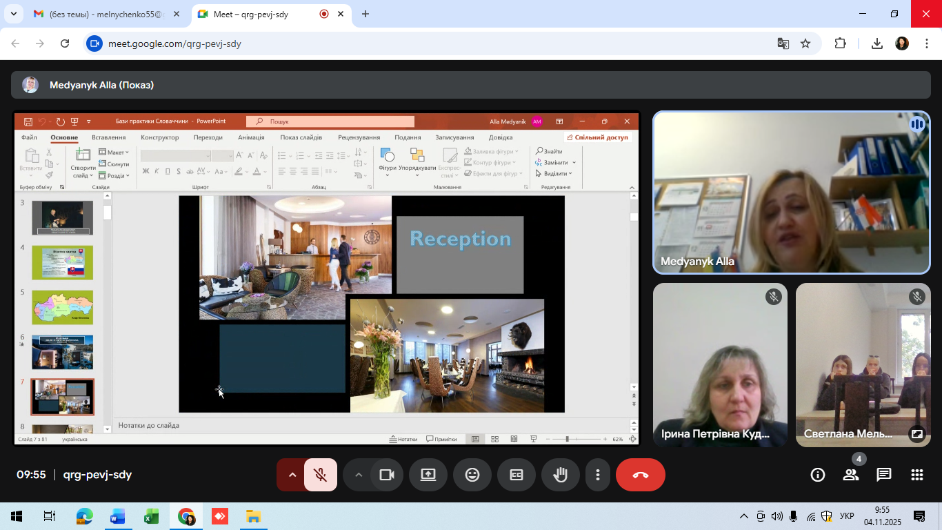 Алла Михайлівна надала детальну інформацію щодо об’єктів практики, вимог до претендентів на її проходження, переліку необхідних документів. Презентація, яка супроводжувала виступ, дала можливість візуально ознайомитися з європейським підходом до надання готельно-ресторанних послуг у підприємствах-майбутніх базах практик. Пані Алла згадала позитивний досвід проходження практичної підготовки здобувачами вищої освіти НУБіП України у минулі роки та акцентувала увагу на можливостях проходження паралельно з практикою стажування в Академії професійної освіти «Меркур», що є одним із напрямів міжнародної мобільності.