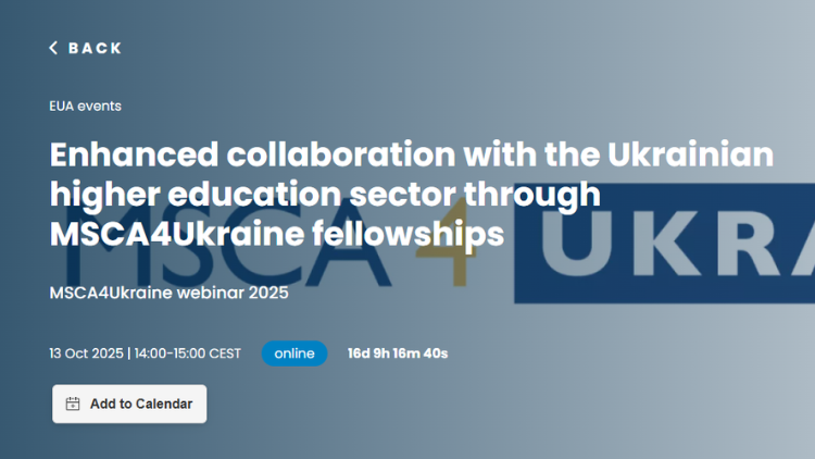 13 жовтня 2025 року о 15:00 за київським часом (14:00 CEST) відбудеться вебінар, присвячений можливостям розширення міжнародної співпраці українських закладів вищої освіти через програму MSCA4Ukraine.