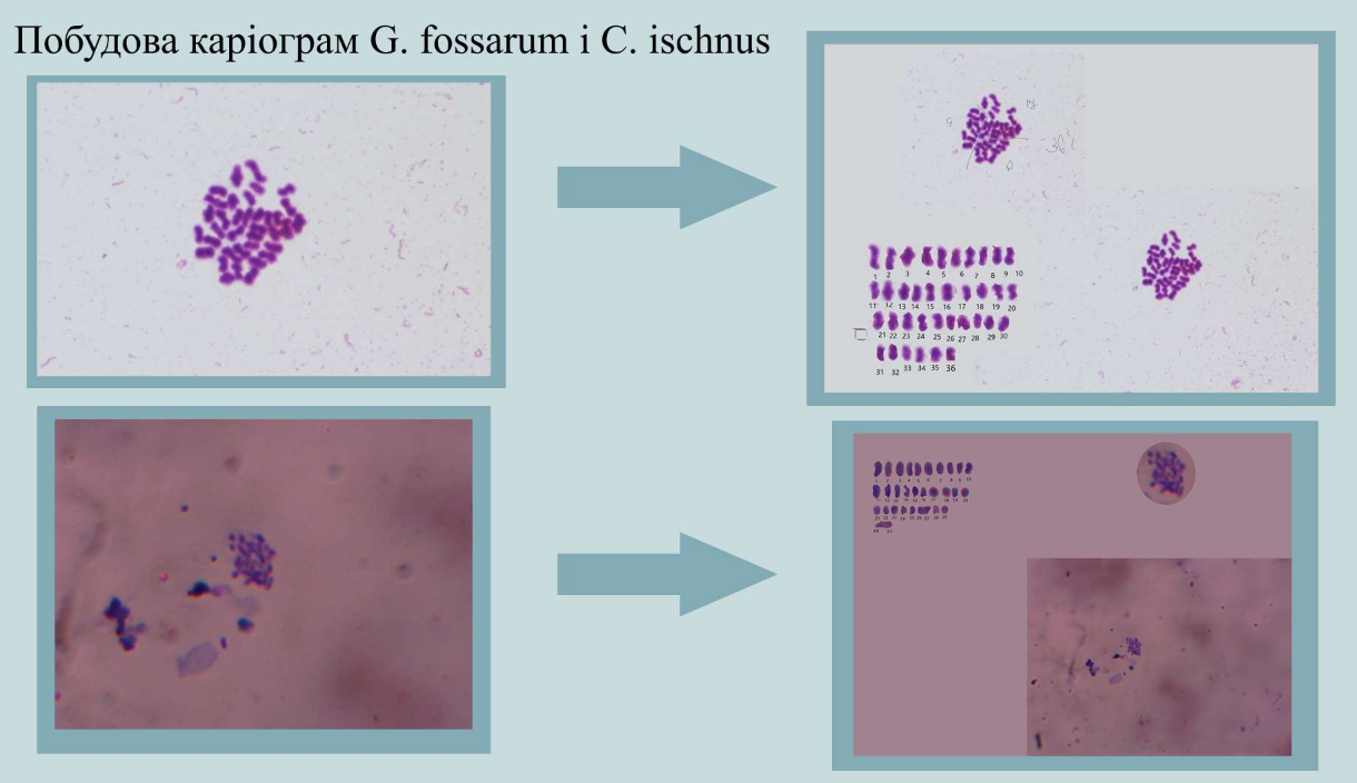 Основна частина виступу була присвячена дослідженню каріотипів двох видів бокоплавів — Gammarus fossarum та Chaetogammarus ischnus. Спочатку доповідачка детально зупинилася на вивченні клітинного поділу, зокрема мейозу I та мейозу II, які є ключовими для аналізу хромосомних перебудов. Було розглянуто етапи клітинного циклу, будову хромосом, а також послідовність фаз мейозу з акцентом на профазу I та процеси синапсису і кросинговеру.