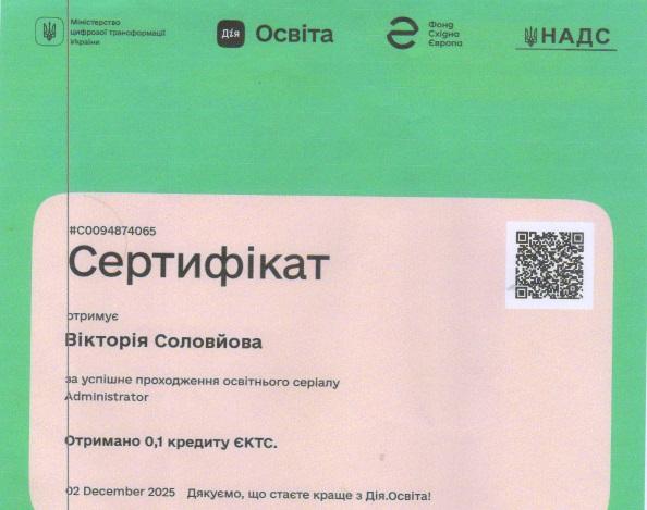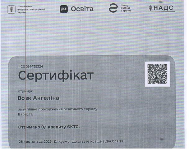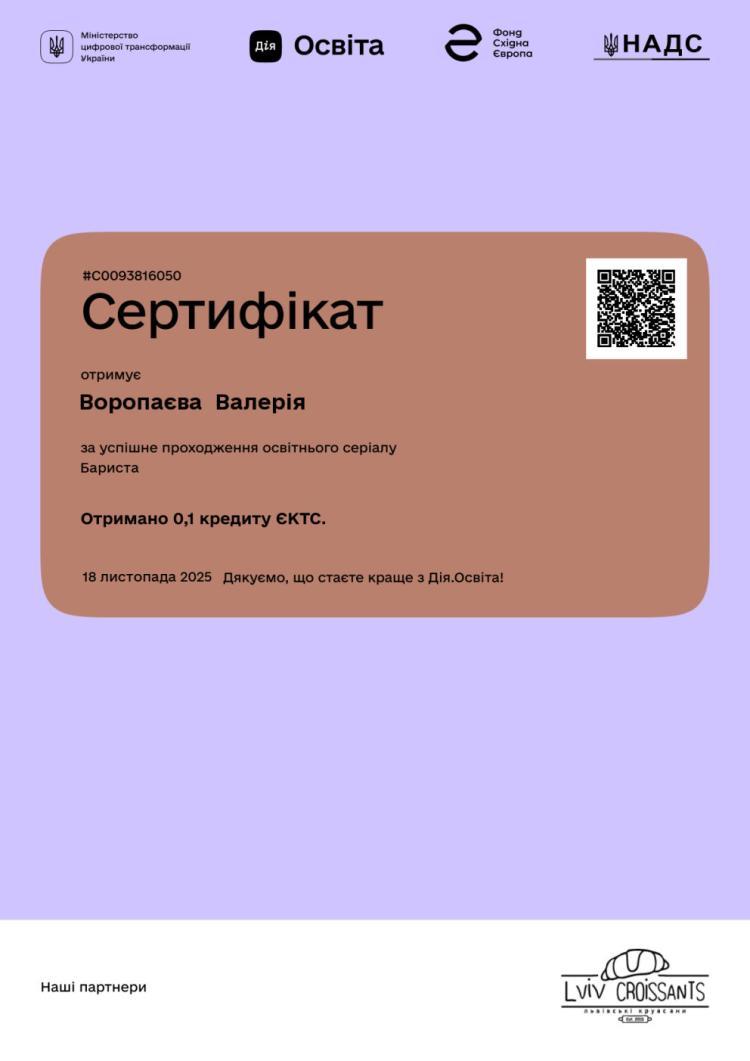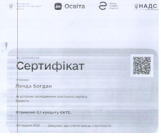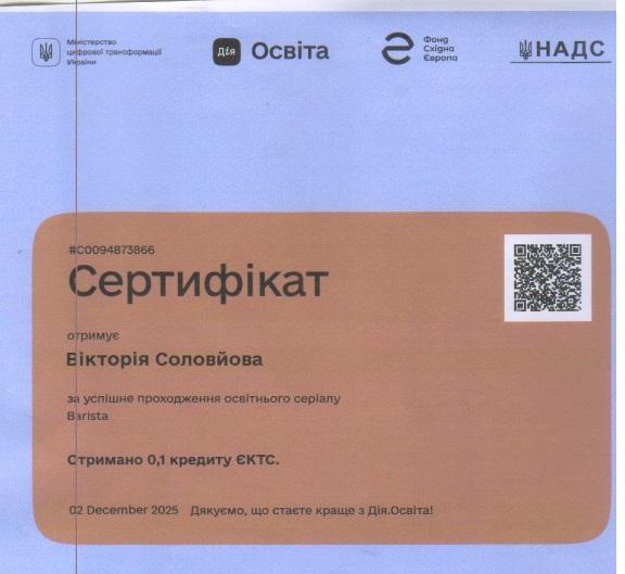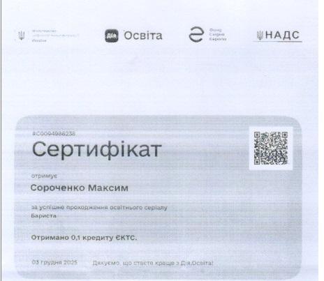 Зокрема, здобувачі ступеня вищої освіти «бакалавр» Ангеліна ВОВК, Ілля ГРИЩЕНКО, Дар’я КРАВЧЕНКО, Богдан ЛЕНДА, Лілія РОЖКОВА, Вікторія СОЛОВЙОВА, Максим СОРОЧЕНКО, Богдан СПІДЧУК, Софія СТРОГАНОВА, Надія ТКАЧЕНКО долучилися до програм неформальної освіти та підтвердили результати навчання відповідними сертифікатами. Студенти опанували освітні серіали «Administrator» та «Barista» на національній платформі «Дія.Освіта», отримавши по 0,1 кредиту ЄКТС за кожен курс. Програми були спрямовані на формування практичних навичок організації роботи адміністратора закладу сфери гостинності, ефективної комунікації з гостями, дотримання стандартів сервісу, а також опанування базових технологій приготування та подавання кавових напоїв і стандартів роботи бариста, що відповідає професійним компетентностям майбутніх фахівців сфери туризму та гостинності.