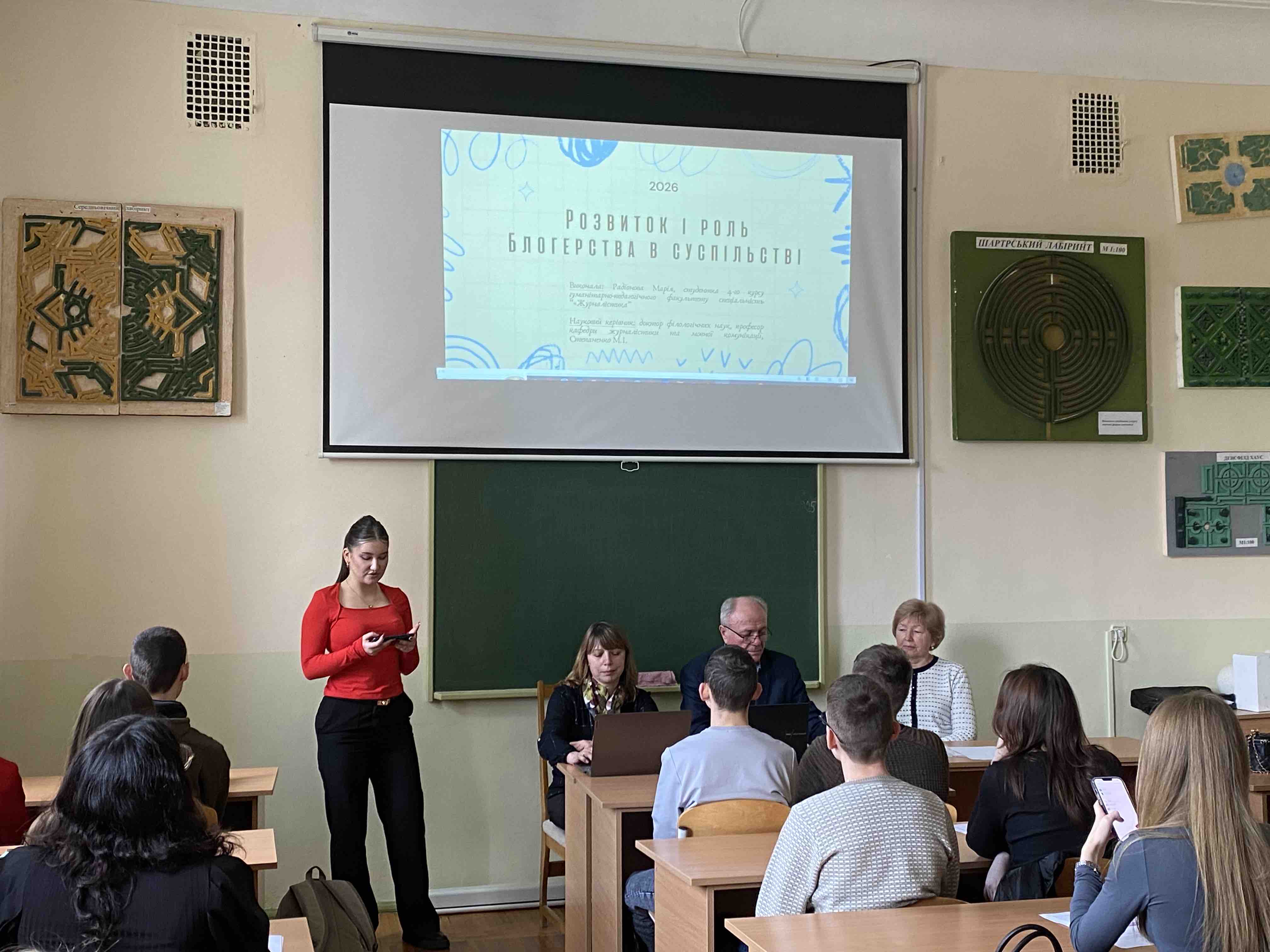 1 місце — Марія РАДІОНОВА. Тема дослідження «Розвиток і роль блогерства в суспільстві» (науковий керівник — доцент кафедри журналістики та мовної комунікації Ніна СТЕПАНЕНКО).