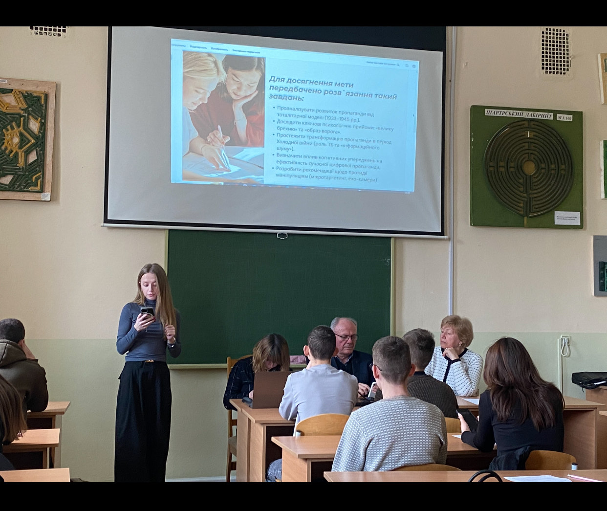 2 місце — Христина ГІМБЕР. Тема дослідження «Маніпуляція свідомістю: шлях пропаганди від тоталітарного режиму до цифрової постправди» (науковий керівник — професор кафедри журналістики та мовної комунікації Микола СТЕПАНЕНКО).