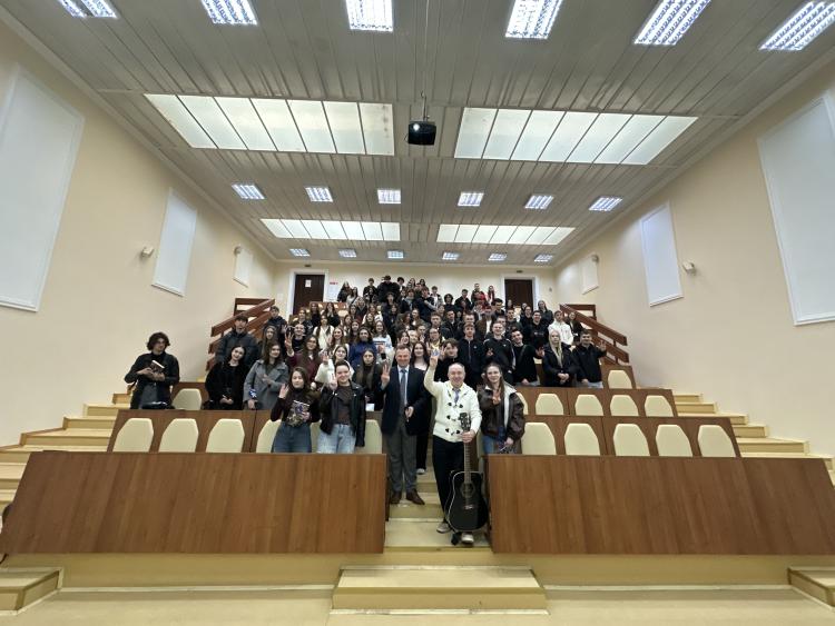 Особливою родзинкою зустрічі стала жива та емоційна атмосфера: спікер не лише виступав, а й співав, грав на гітарі та залучав аудиторію до спільного виконання народних пісень, що створило відчуття єдності та щирого діалогу.
