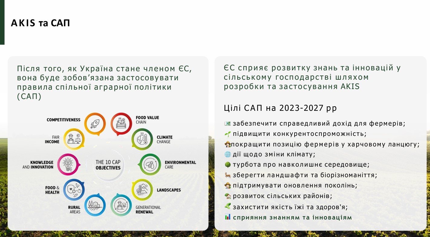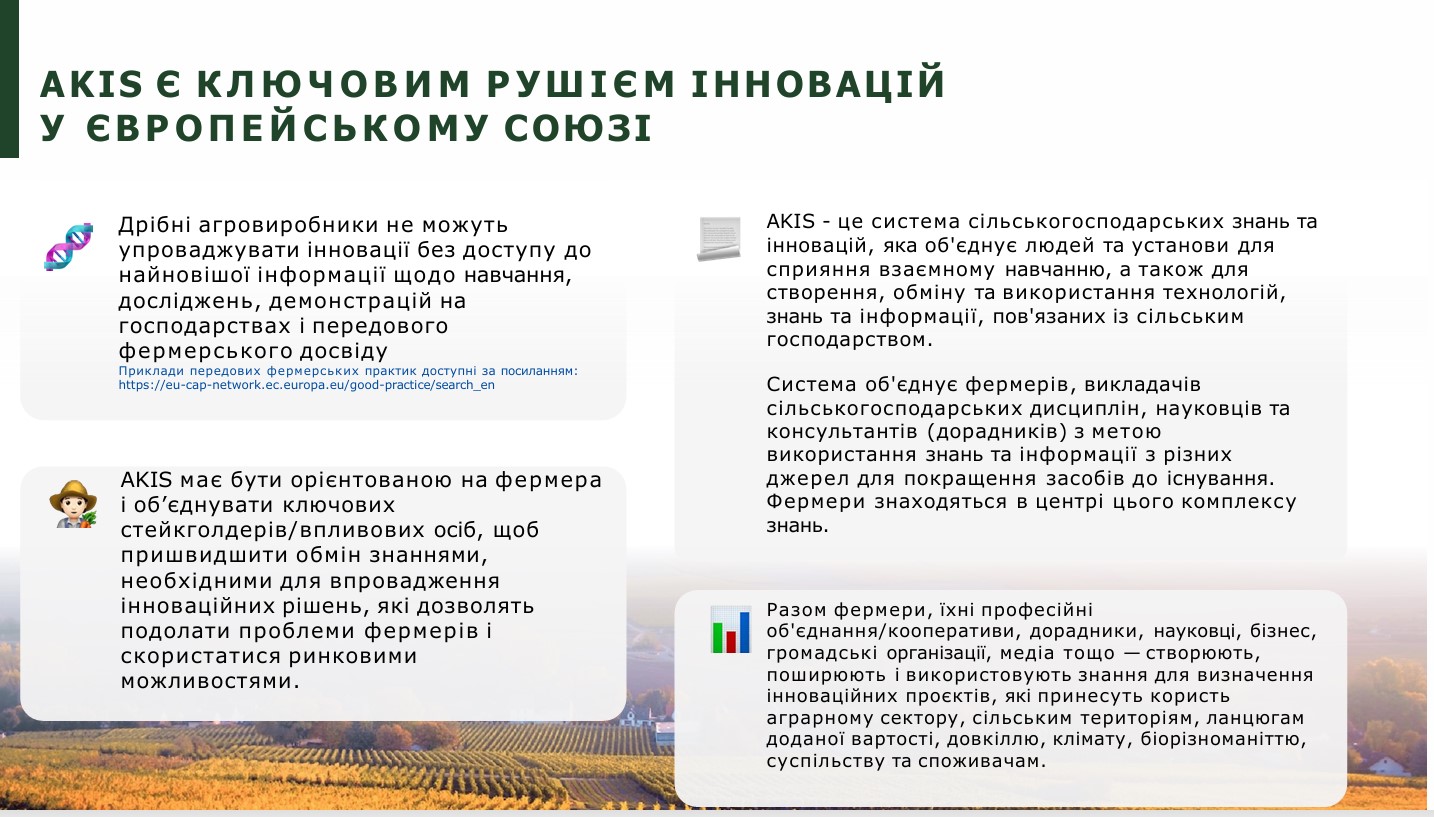 Лектор підкреслив, що розвиток AKIS – це не лише технічна реформа, а зміна підходу до управління знаннями у сільському господарстві. Сучасна модель орієнтована на створення ефективної екосистеми, у якій інформація, знання та досвід стають основними ресурсами розвитку.