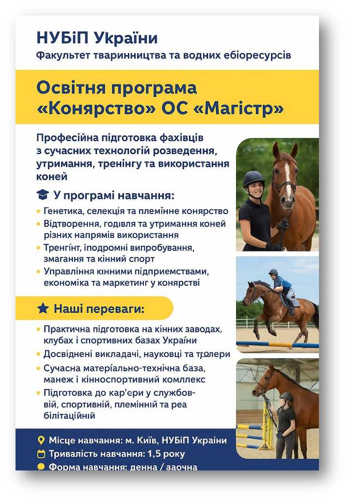 Освітньо-професійна програма «Конярство» спрямована на підготовку висококваліфікованих фахівців у галузі тваринництва зі спеціалізацією у сфері розведення, утримання, використання та відтворення коней різних порід і напрямів продуктивності. Програма поєднує фундаментальну теоретичну підготовку з практичними навичками, необхідними для ефективної професійної діяльності в сучасних умовах аграрного виробництва.