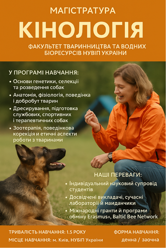Освітньо-професійна програма «Кінологія» спрямована на підготовку висококваліфікованих магістрів, здатних комплексно вирішувати наукові, практичні та управлінські завдання у сфері кінології з урахуванням сучасних вимог до утримання, розведення, дресирування та використання собак різного призначення. Програма поєднує фундаментальну теоретичну підготовку з практикоорієнтованим навчанням і розвитком дослідницьких компетентностей.