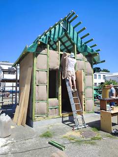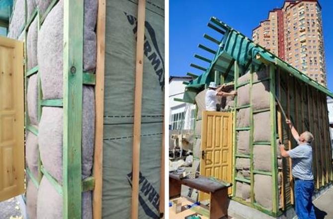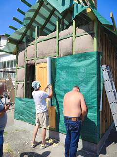Окрім костробетону, головну фасадну стіну будиночку було виконано із дерев’яного каркасу, наповненого конопляним утеплювачем, наданим кафедрі будівництва наступними партерами.