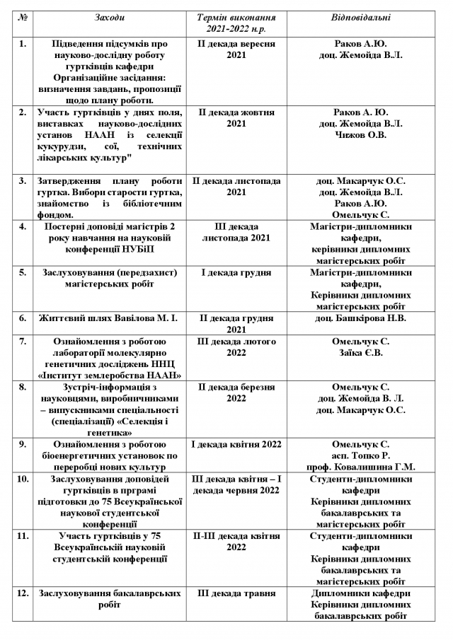 План роботи студентського наукового гуртка кафедри генетики, селекції та насінництва ім. проф. М.О.Зеленськогона 2021-2022 навчальні роки