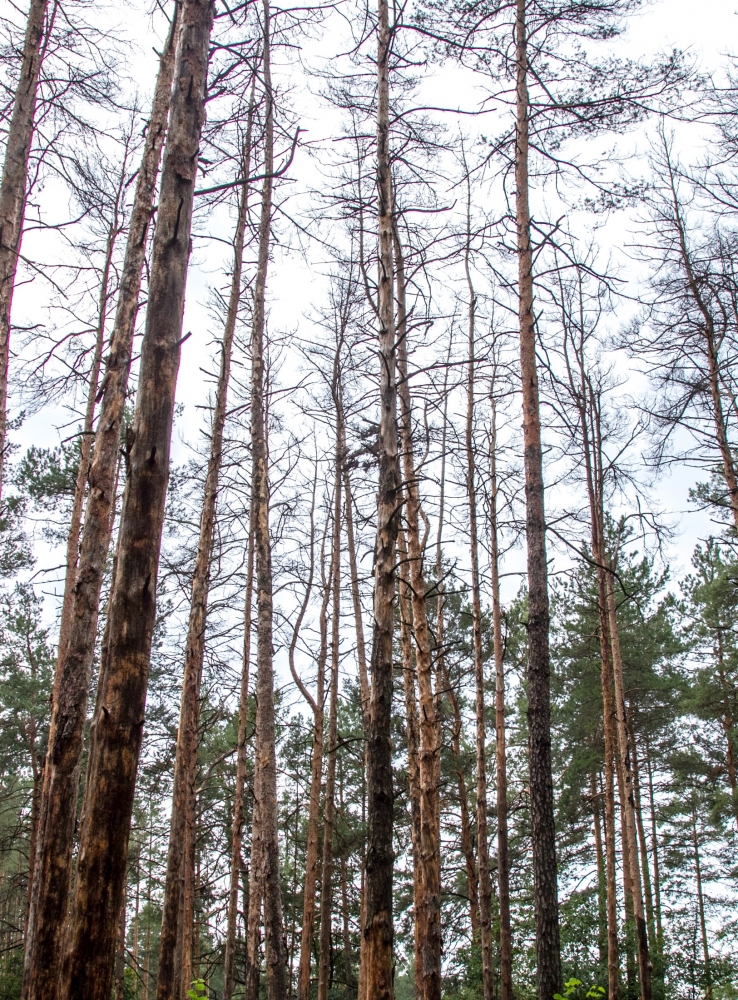 Далі учасники семінару виїхали для очного ознайомлення та огляду осередків всихання безпосередньо до лісових насаджень Дніпровського та Білодібровного лісництв, де мали змогу ознайомитися з ситуацією та провести огляд в насадженнях. Практично неозброєним оком можна спостерігати за динамікою збільшення площ всихаючих деревостанів. На модельних деревах чітко прослідковується наявність численних ходів верхівкового та шестизубчастого короїдів, водночас, у ходах верхівкового короїда поширюються офіостомові гриби – збудники синяви деревини. Верхівковий короїд розвивається у декількох поколіннях на рік, частина особин верхівкового короїда зимує на стадії жука у підстилці чи під корою, а решта – на стадії личинки. Тому після зимівлі спочатку вилітають жуки, які зимували під корою, потім ті, що зимували у підстилці, а в останню чергу – ті що зимували на стадії личинки, і з травня до вересня є загроза заселення цим шкідником дерев. В осередках верхівкового короїда хвоя заселених дерев упродовж декількох тижнів змінює колір на світло-зелений, а потом на червонуватий.