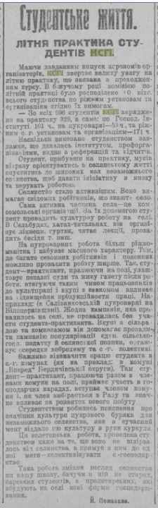 1924 рік. Літня практика студентів КСГІ (вирізка з газети"Більшовик" (Київ), №238 від 18.10.1924 р.)