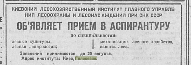 Оголошення про прийом до аспірантури Київського Лісогосподарського інституту