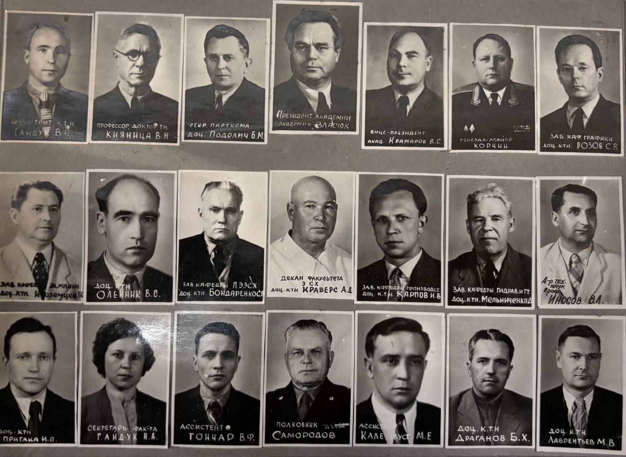 (мова оригіналу: асс. Гайдук В.Н., проф., д.т.н. Кияница В.Н., секр. парткома, доц. Подолич Б.М., Президент Академии, академик Власюк, вице-президент, акад. Крамаров В.С., генерал-майор Корчин, зав. каф. графики, доц., к.т.н. Розов С.В., зав. кафедри эл. машин, доц., к.т.н. Иноземцев Б.Е., доц., к.т.н. Олейник В.С., зав. кафедры ПЭЭСХ, доц., к.т.н. Бондаренко С.В., декан факультета ЭСХ, доц., к.т.н. Краверс А.Д., зав. кафедры производст., доц., к.т.н. Карпов И.В., зав. кафедры гидрав., доц., к.т.н. Мельниченко Д., д.т.н., проф. Иносов В.Л., доц., к.т.н. Притака И.П., секретарь фак-та Гайдук Н.А., асс. Гончар В.Ф., полковник Самородов, асс. Калекуст М.Е.)