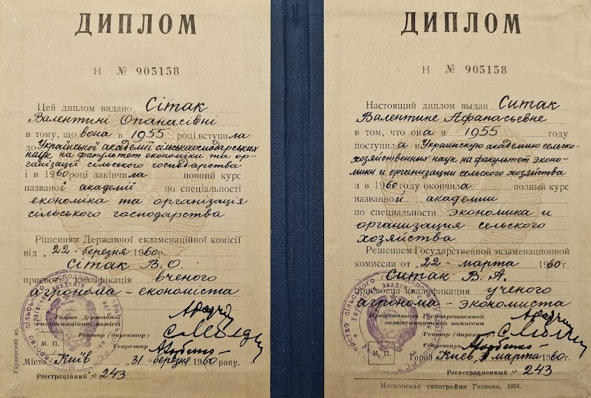 Цей диплом видано СІТАК Валентині Опанасівні в тому, що вона в 1955 році вступила до Української академії сільськогосподарських наук на факультет економіки та організації сільського господарства і в 1960 році закінчила повний курс названої академії по спеціальності економіка та організація сільського господарства.