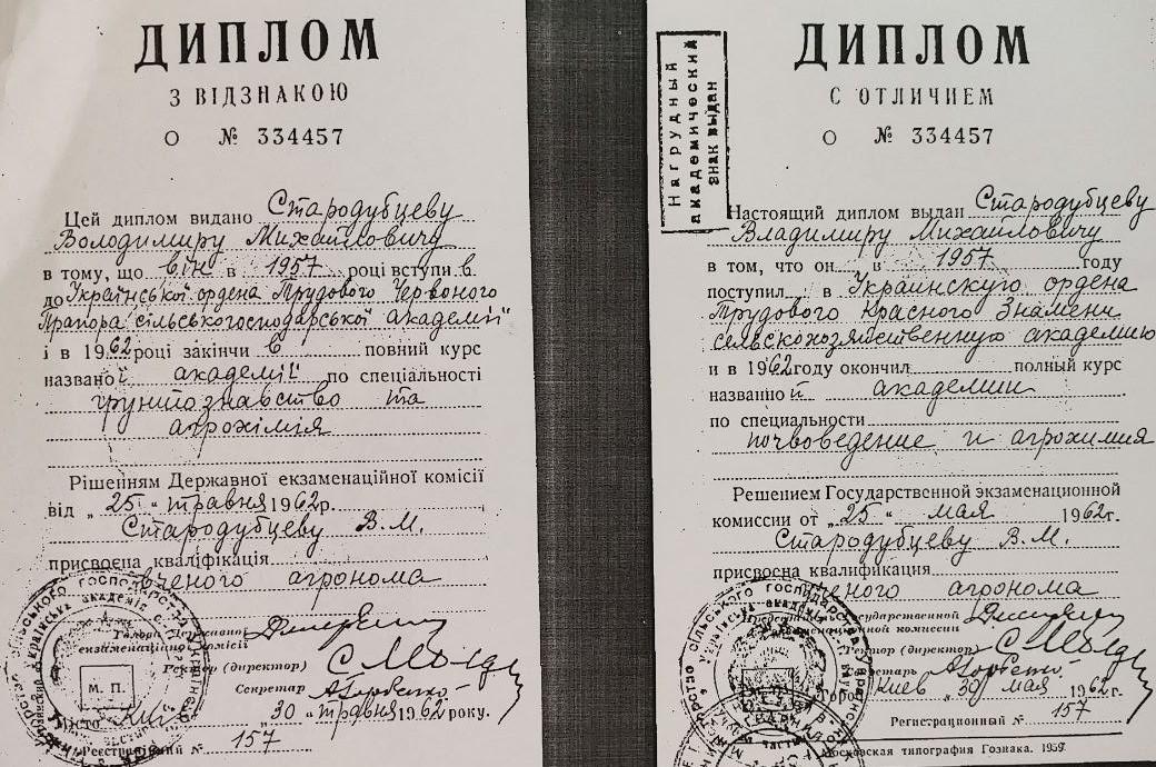 Цей диплом видано СТАРОДУБЦЕВУ Володимиру Михайловичу в тому, що він у 1957 році вступила до Української академії сільськогосподарських наук і в 1962 році закінчив повний курс названої академії по спеціальності ґрунтознавство та агрохімія.