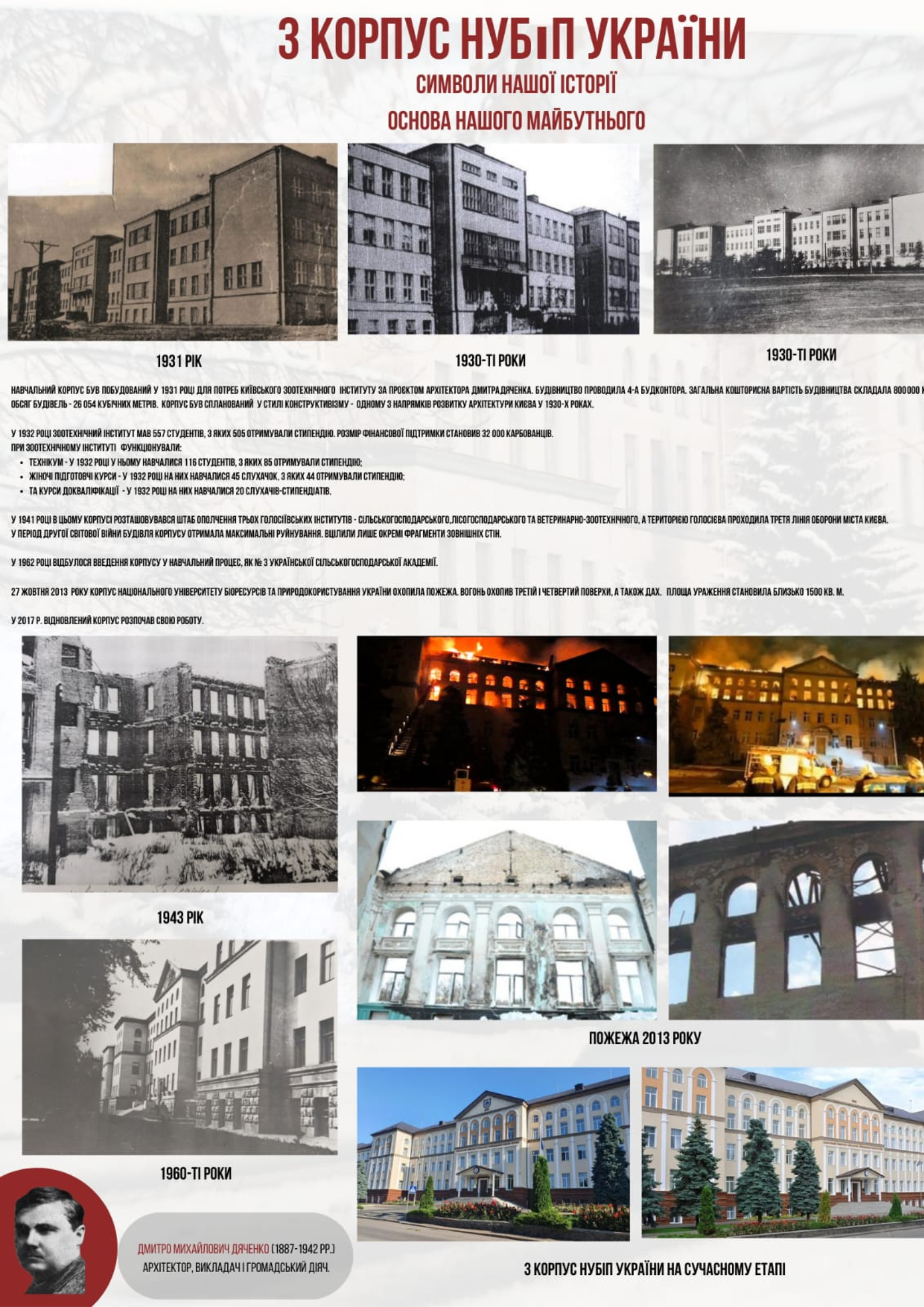 У 1926 р. розпочалося масштабне будівництво навчальних корпусів, житлового будинку для викладачів та студентського гуртожитку для Київського сільськогосподарського інституту (нині – НУБіП України). Ця подія стала визначальним етапом у розвитку університету, заклавши підґрунтя для формування сучасного студентського містечка. У травні 2026 р. НУБіП України буде відзначати 100-річчя з початку цього історичного будівництва. З метою підготовки до ювілею студенти 1 курсу спеціальності «Філологія» реалізували студентський проєкт із дослідження історії побудови корпусів. У межах проєкту молоді дослідники вивчали архівні документи, спогади викладачів, а також підготували тематичні матеріали для музею університету.