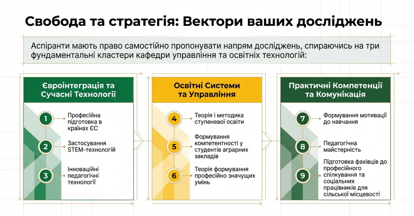 Аспіранти кафедри управління та освітніх технологій можуть самостійно пропонувати напрям своїх наукових досліджень, представляючи їх у вигляді наукової доповіді (реферату) представленої на розгляд екзаменаційної комісії кафедри управління та освітніх технологій.