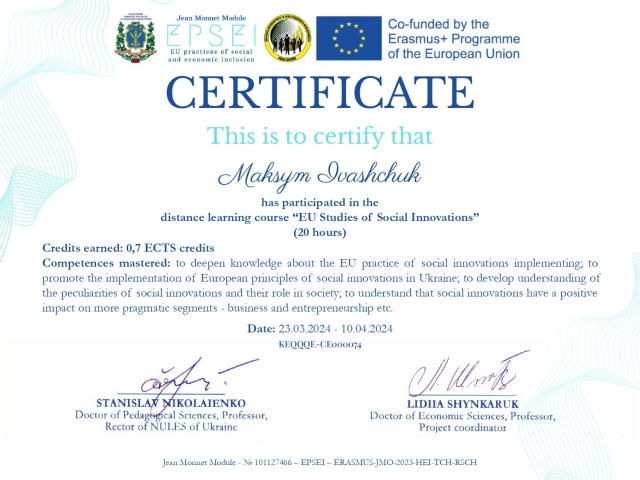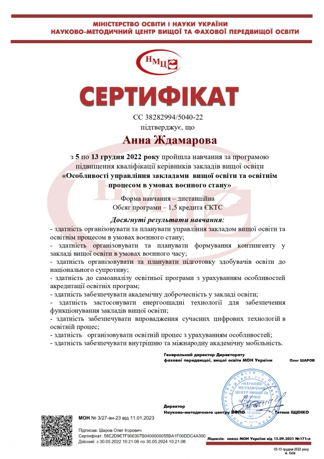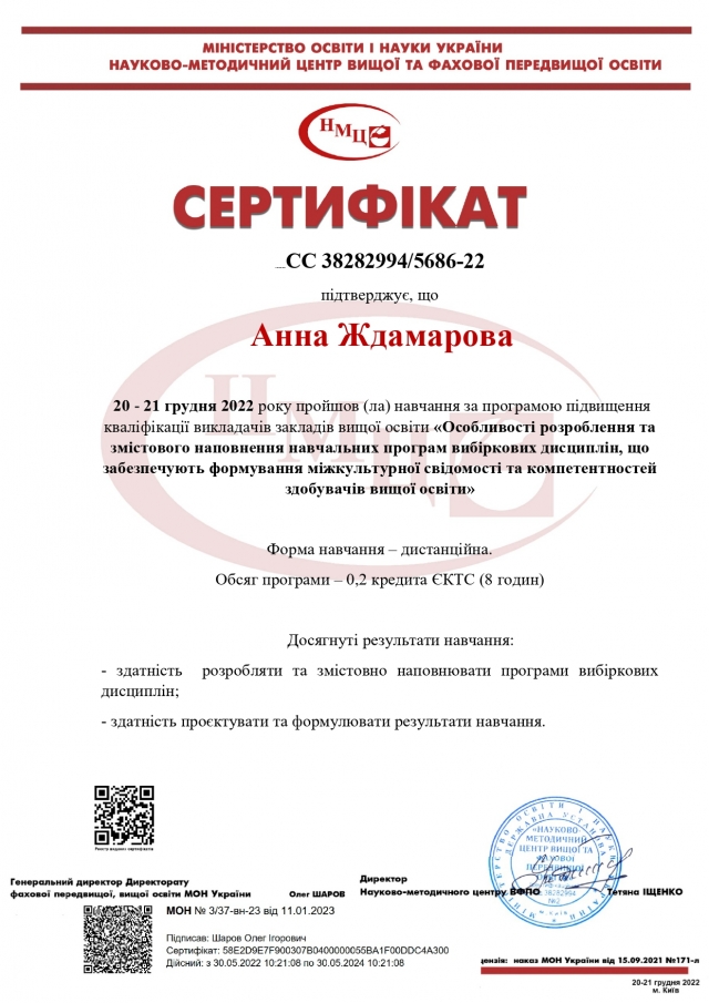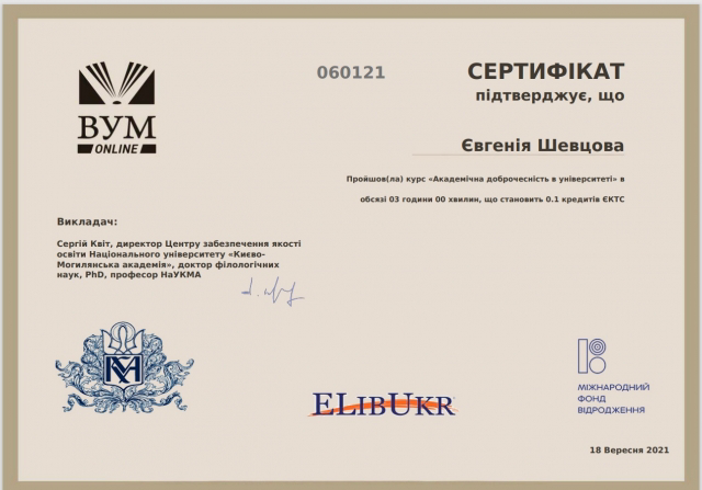 1.Отримала сертифікат про успішно пройдений курс «Академічна доброчесність в університеті».