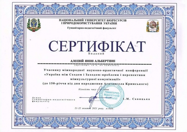 2. Алєєва Я.А. Тема: Увічнення пам'яті Агатангела Кримського в Україні. Україна між Сходом і Заходом: проблеми і перспективи міжкультурної комунікації (до 150 - річчя від дня народження Агатангела Кримського): зб. матеріалів міжнародної наук.-практ. конф., Київ, 21-22 жовтня 2021 р.. с. 189-190.