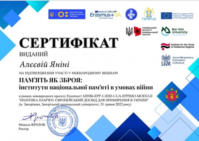 2. Взяла участь в міжнародному вебінарі «Пам'ять, як зброя: інститути національної пам'яті в умовах війни». В межах міжнародного проекту Erasmus +620386 -ЕРР-1-2020-1 – UA -EPPJMO-MODULE “Політика пам’яті: Європейський досвід для примирення в Україні”, 31 травня 2022 р.