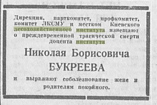 Некролог на смерть Миколи Борисовича Букреєва - доцента Київського Лісогосподарського інституту (з газети "Советская Украина", № 188 від 17.08.1939 року).