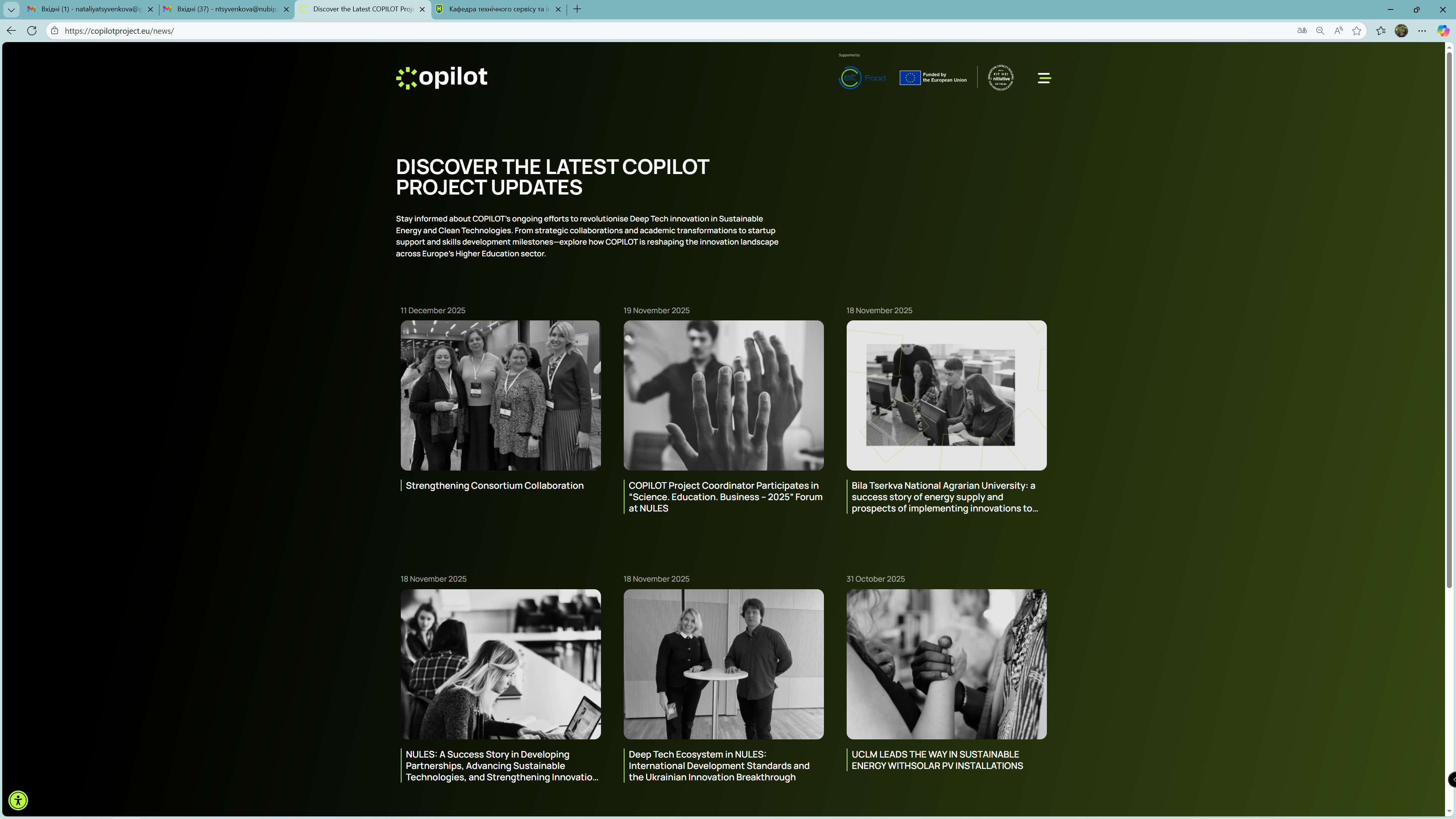 NUBiP of Ukraine is responsible for the implementation of work package 7 "Knowledge sharing – success stories". As part of the implementation of the tasks under this work package, the project website (copilotproject.eu) has already posted success stories from NUBiP of Ukraine (A Success Story in Building Partnerships, Advancing Sustainable Technologies, and Strengthening Innovation and Entrepreneurship), BNAU (Bila Tserkva National Agrarian University: a success story of energy supply and prospects of implementing innovations to achieve Sustainable Development Goals), and the University of Castilla-la Mancha (UCLM Leads the Way in Sustainable Energy with Solar PV Installations). Also, Lyubov SHYMKO (NUBiP of Ukraine) and Ivan OMAROV (BNAU) recorded a podcast "Deep Tech Ecosystem in NULES: International Development Standards and the Ukrainian Innovation Breakthrough", based on success stories and joint achievements of NUBiP of Ukraine and BNAU.