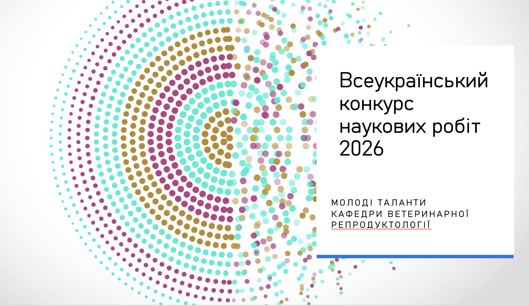 Кафедра ветеринарної репродуктології (раніше акушерства, гінекології та біотехнології відтворення тварин) була створена у Київському ветеринарно-зоотехнічному інституті (нині НУБіП України) у 1928 р. і першим її завідувачем став Костянтин Іванович Туркевич. Нині, кафедра – це потужний науково-педагогічний склад, сучасні навчальні та наукові лабораторії в яких студенти 3-х спеціальностей вивчають за новітніми програмами 5 обов’язкових та 11 вибіркових дисциплін, в викладачі - проводять унікальні наукові дослідження.